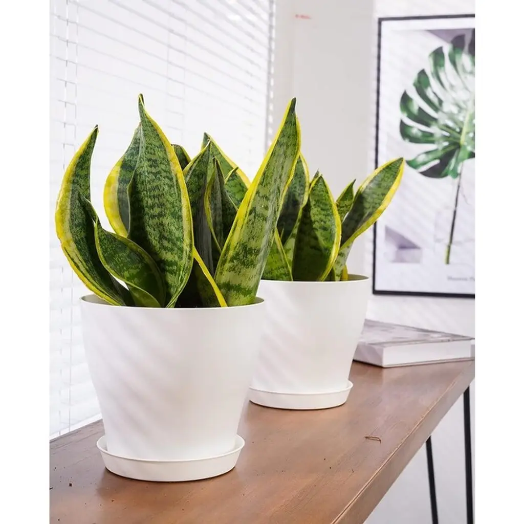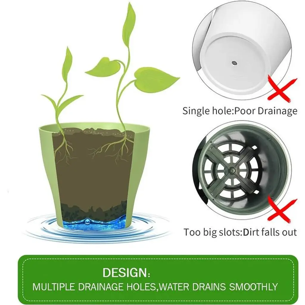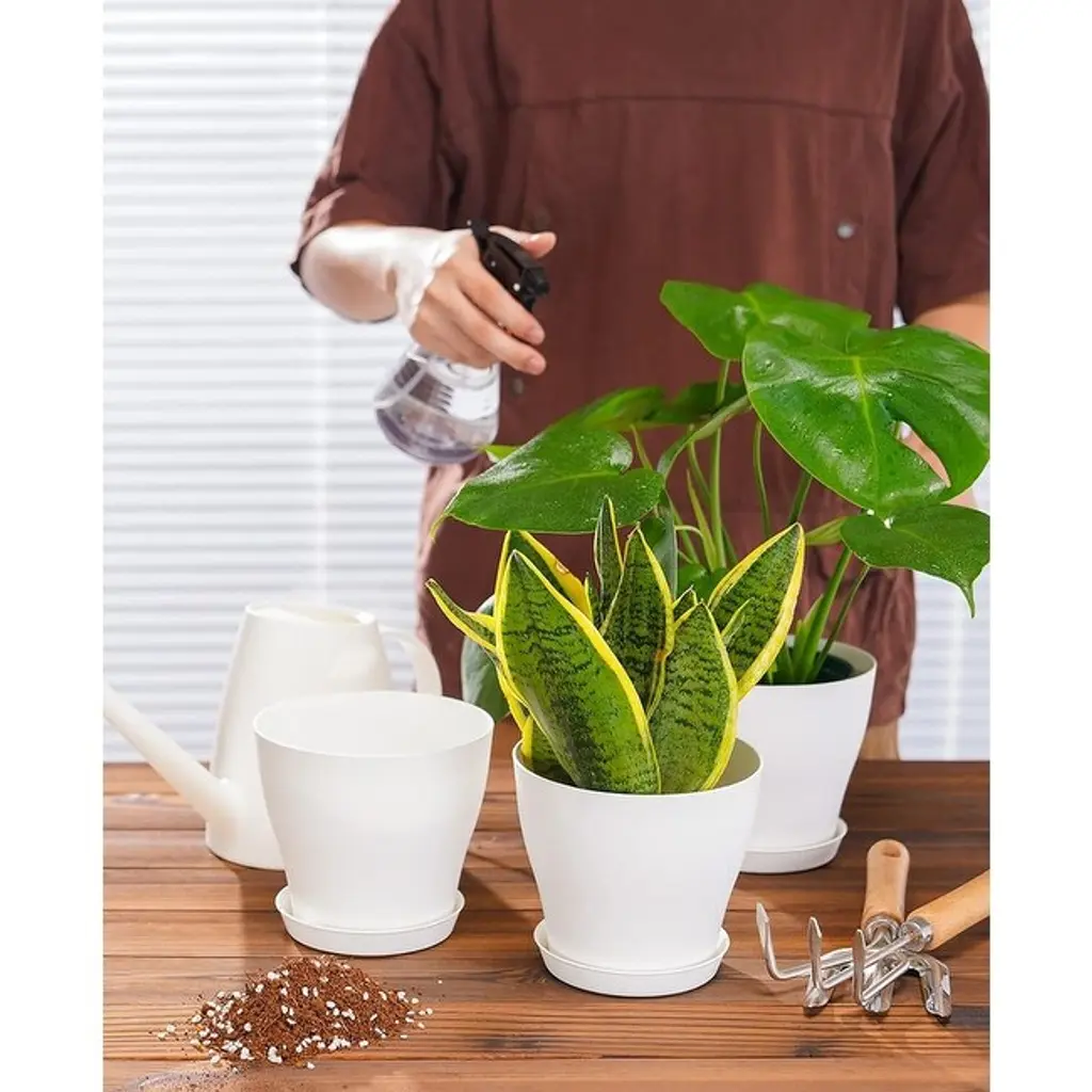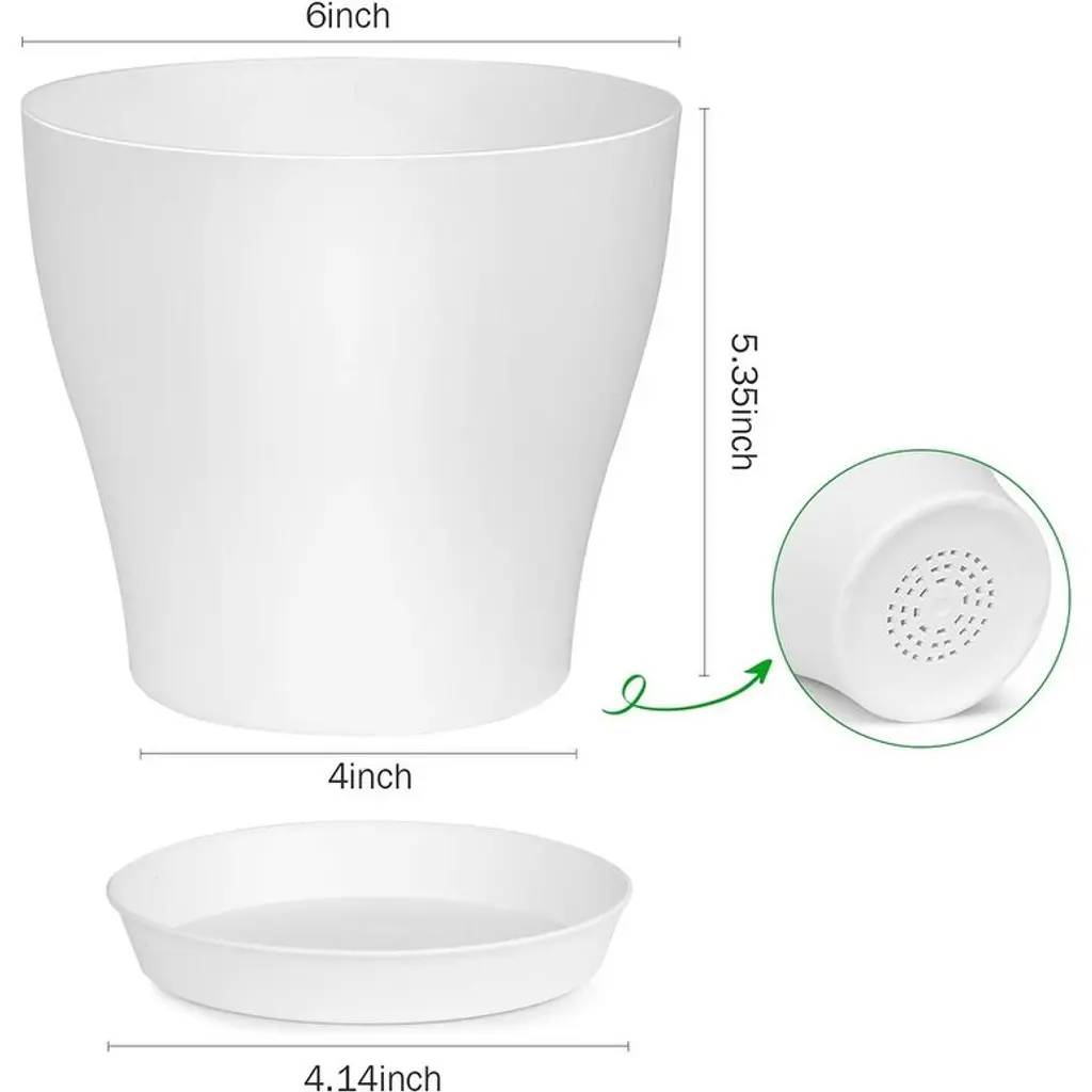 Unique Drainage Design:The Multi-Hole drainage design of this set of plastic plant pots can truly solve the problems faced by most plant lovers, the small holes arranged at the bottom can ensure that the drainage system will not be blocked, and will not cause soil leakage Most Valuable and Functional:Plant pot set include 15 pieces planting pots and 15 pieces matching tray, you can grow a variety of plants indoor or outdoors, such as orchid, snake plant, mint, parlor palm, devil's ivy, cactus, aloe Light Weight and Durable:These 6 inch nursery pots are made of high quality plastic, super lightweight, sturdy polypropylene make them unable to deform or break. Can be safely placed on the windowsill or repot your plant, without worrying about falling or breaking Modern Simple Design:Full white and matte finishing surface plant pot with streamline-type waist line shape bringing out a modern minimalistic styled and elegant modern visual representation for any home/office decor without any sense of violation Size of Planter Pots:Each plastic pot is 6'' in Opening Diameter, 4'' in Bottom Diameter, 5.3'' in Height. With a tray, these pots for plants are the best choice for growing indoor and outdoor small to medium-sized home/office plants