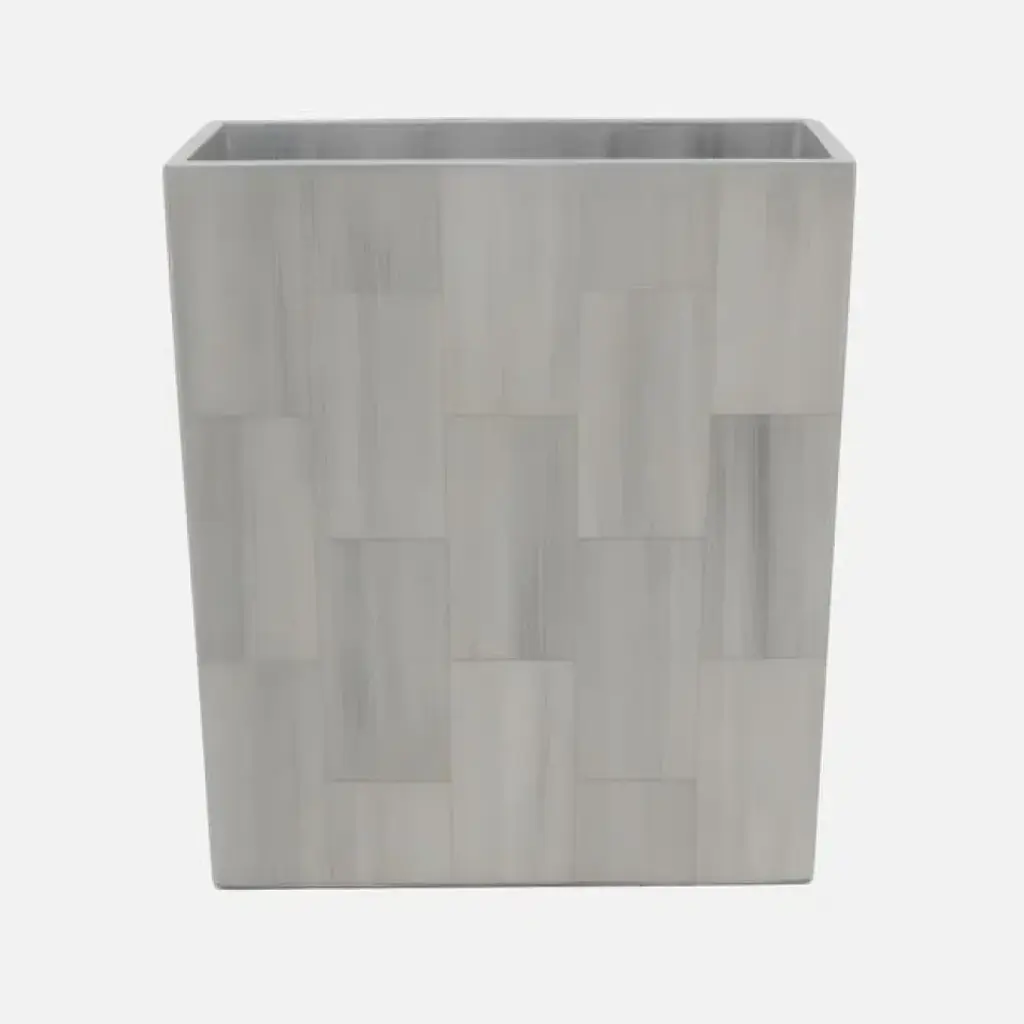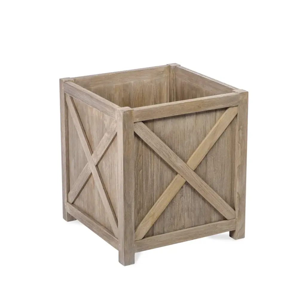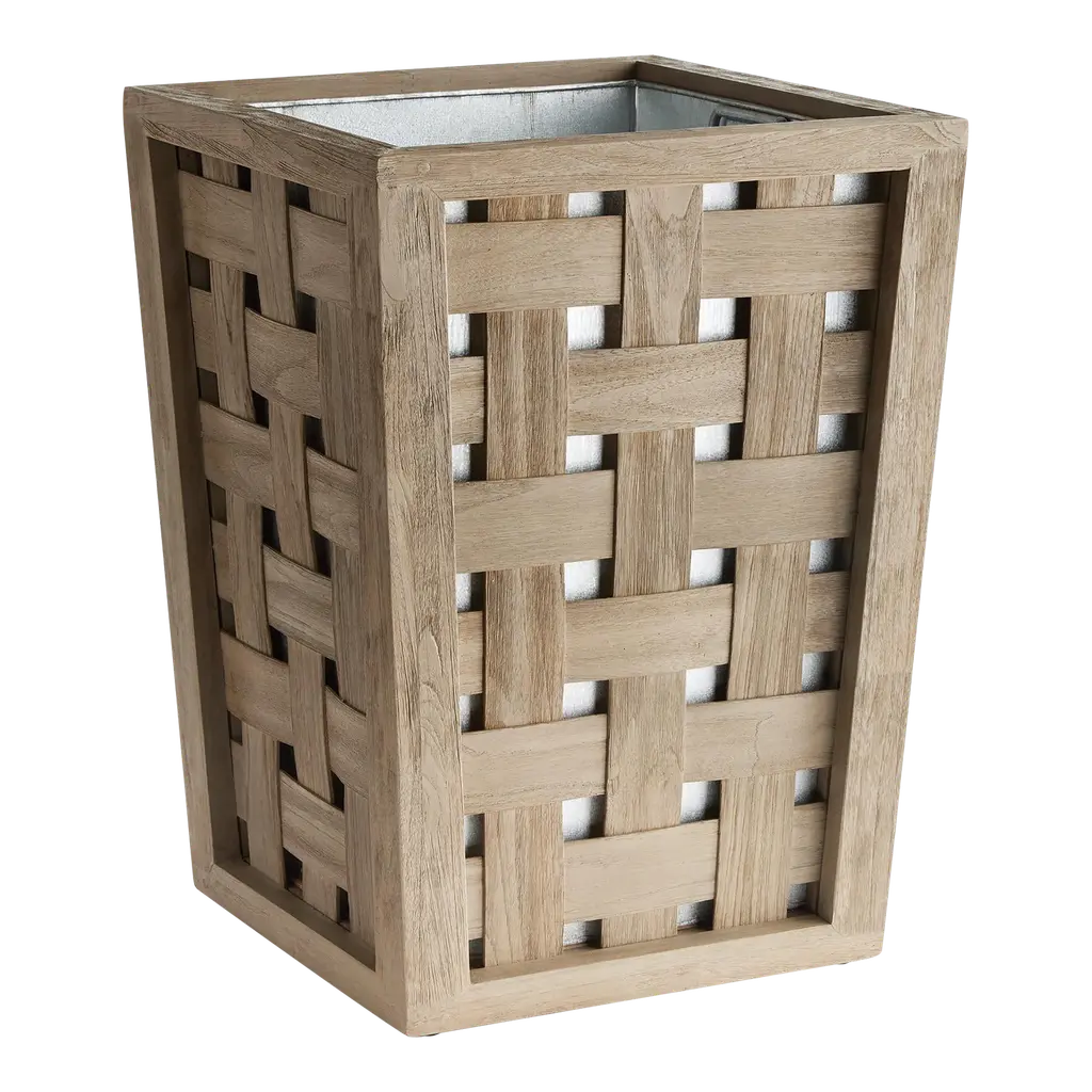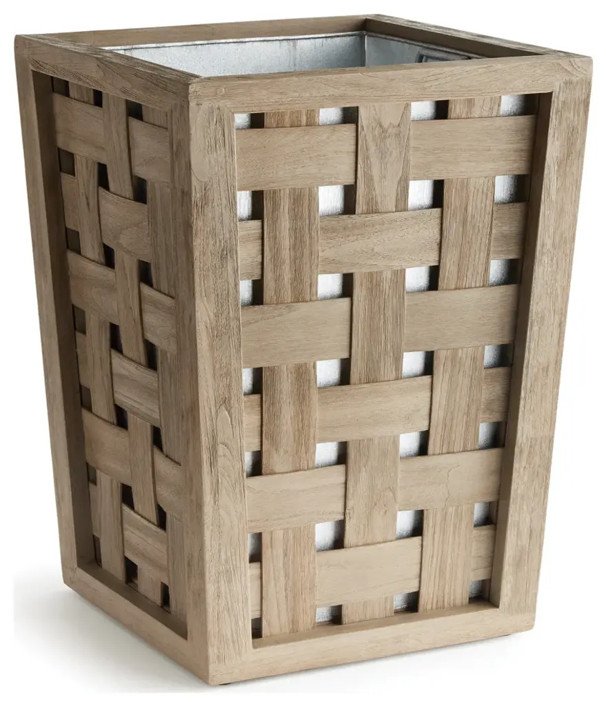 Expertly handwoven using wide gray washed teak wood panels in a checked pattern. An exclusive design you won't see anywhere else, this showstopping planter has a galvanized steel liner with folding handles, drainage hole and is designed with a raised bottom. Smart as well as beautiful!