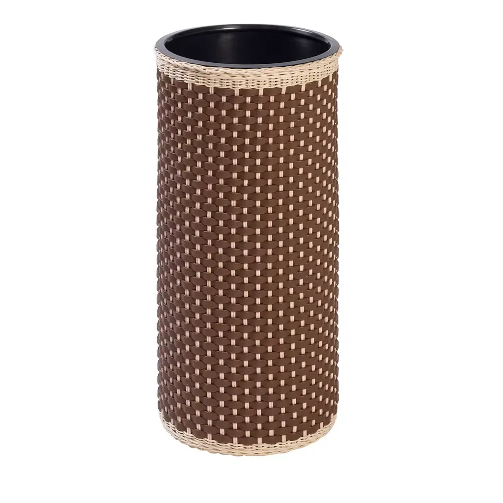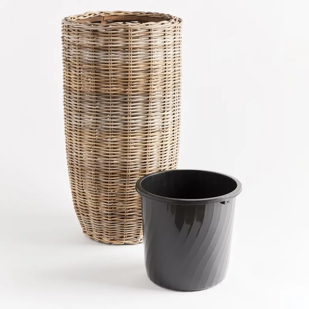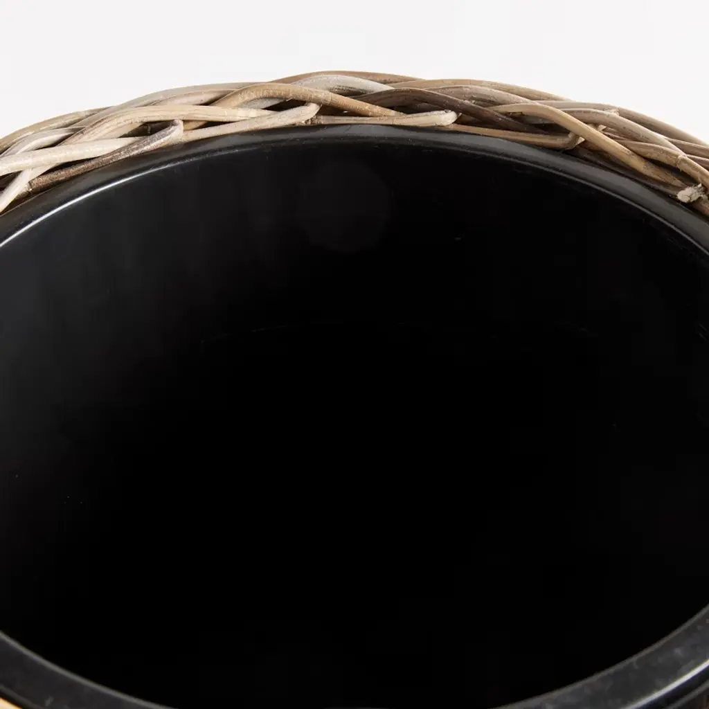 The all-natural varied tones are the beauty of this woven planter. Designed with a flattened weave and complete with grower's pot that sits on an iron frame. A treasure of a planter for the rattan lover.
