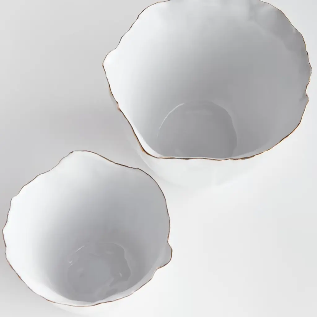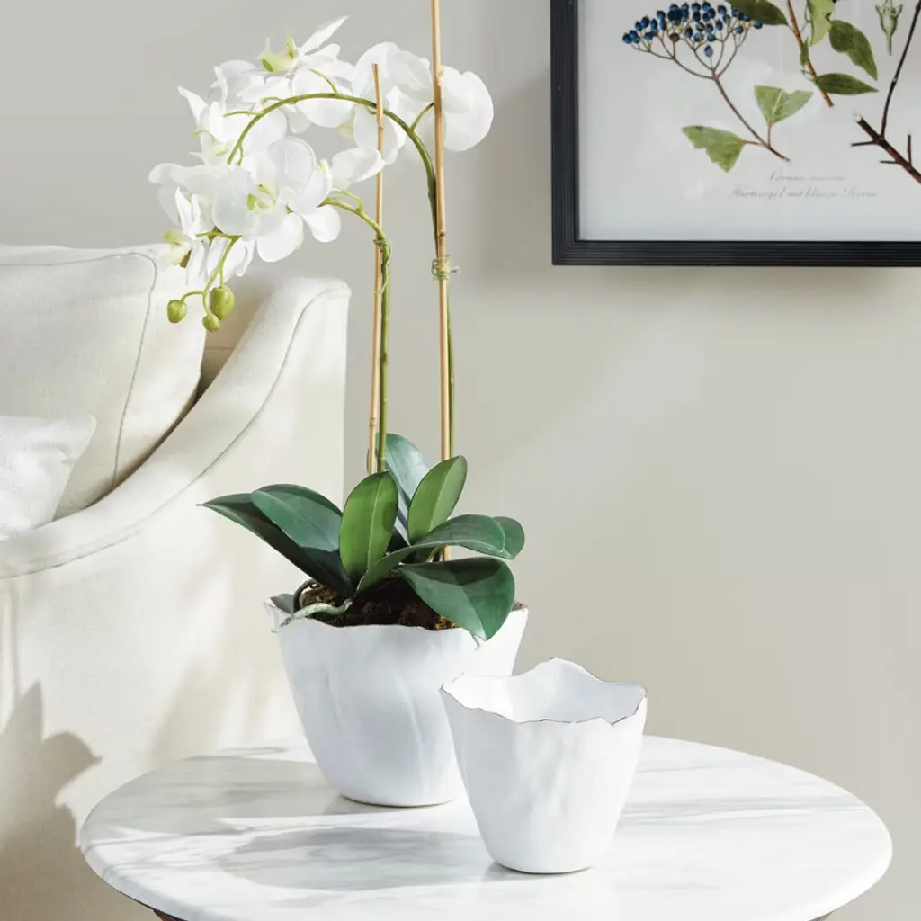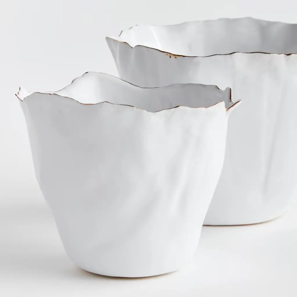 With crimped edges and natural form, this set of cachepots is a real statement-making centerpiece. The hand-brushed gold tipped edges are electroplated for shine and durability. Add your favorite orchid and elevate your space.