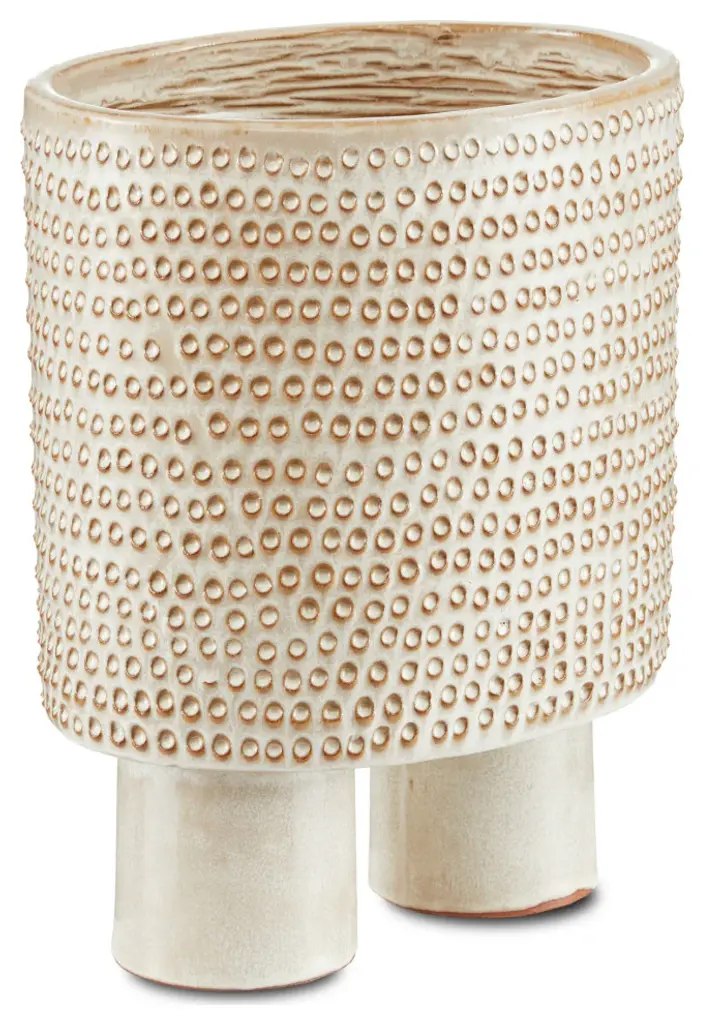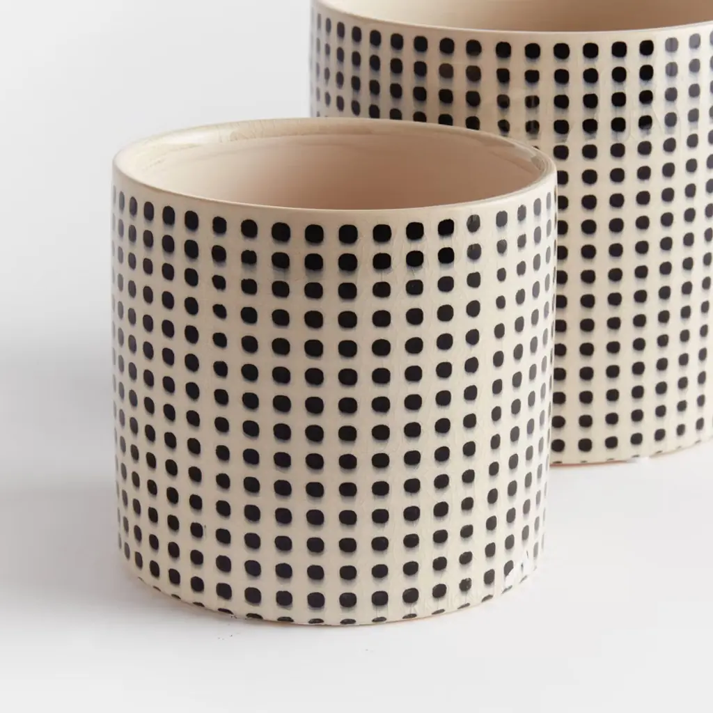 Classic, with a somewhat contemporary edge, these pots are made for the transitional space. A tight repeating dot pattern adorns the perimeter and adds a sophisticated touch.