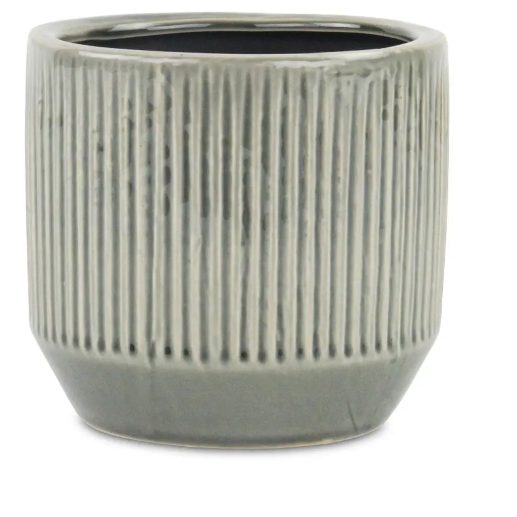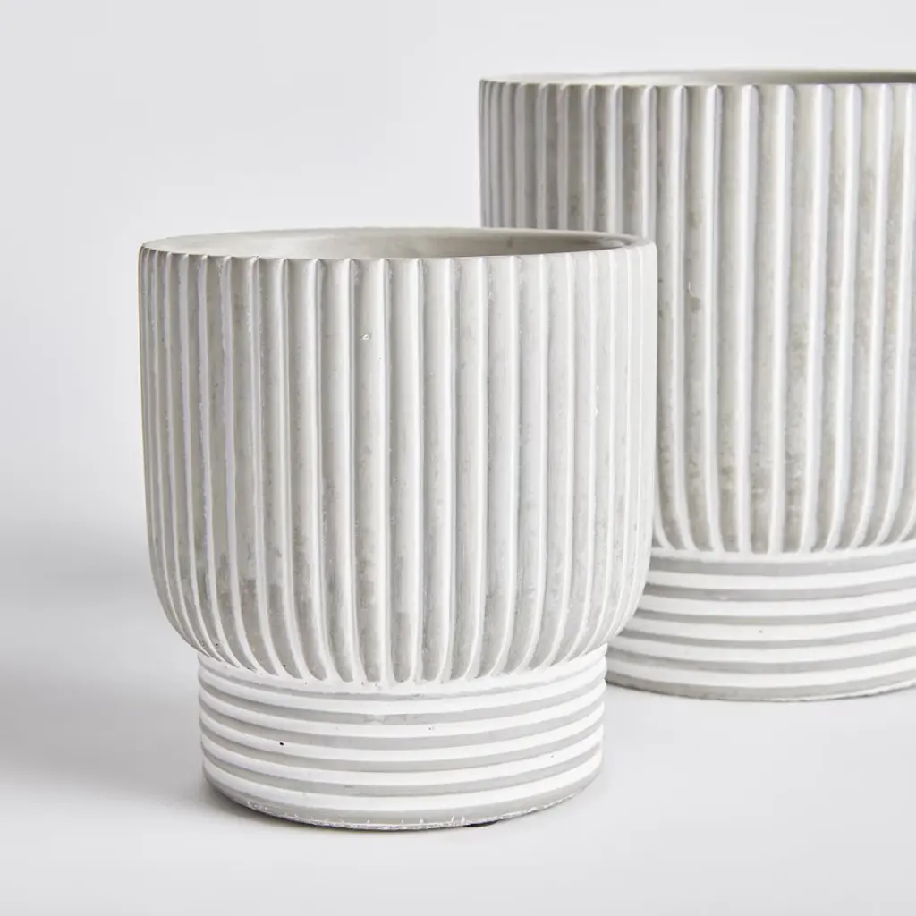 A mixed pattern of horizontal and vertical lines make this set of pots very mod indeed. A translucent white wash artfully fills in the gaps. Add your favorite blooms or lush greens and enhance any contemporary space.