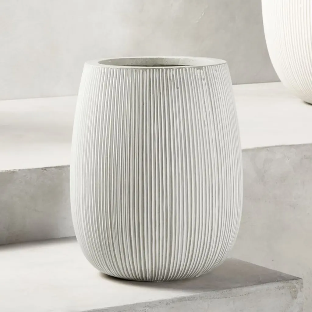 Substantial planter fools the eye. Composed of cement, sand and fiberglass, large-scale pot is surprisingly lightweight and super durable. Warm grey finish makes it a natural fit for any outdoor space. CB2 exclusive.