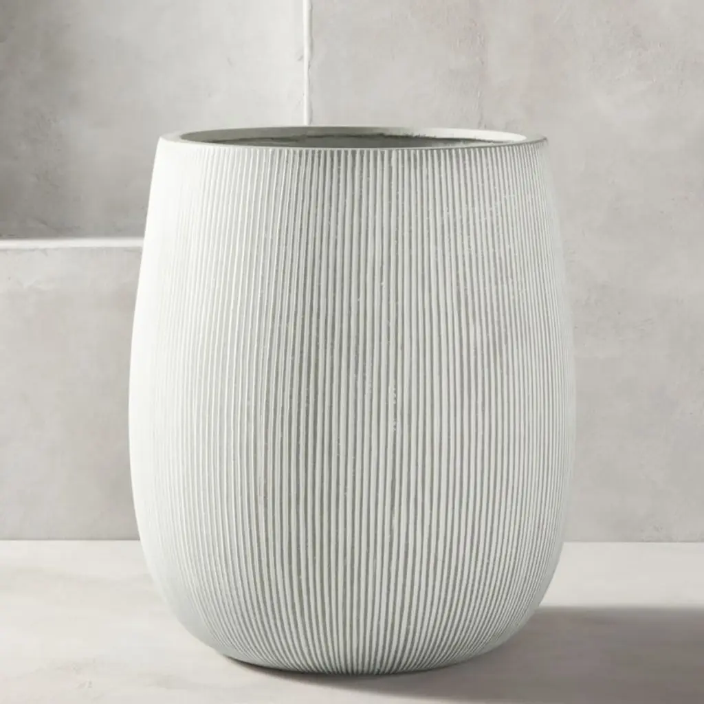 Substantial planter fools the eye. Composed of cement, sand and fiberglass, large-scale pot is surprisingly lightweight and super durable. Warm grey finish makes it a natural fit for any outdoor space. CB2 exclusive.