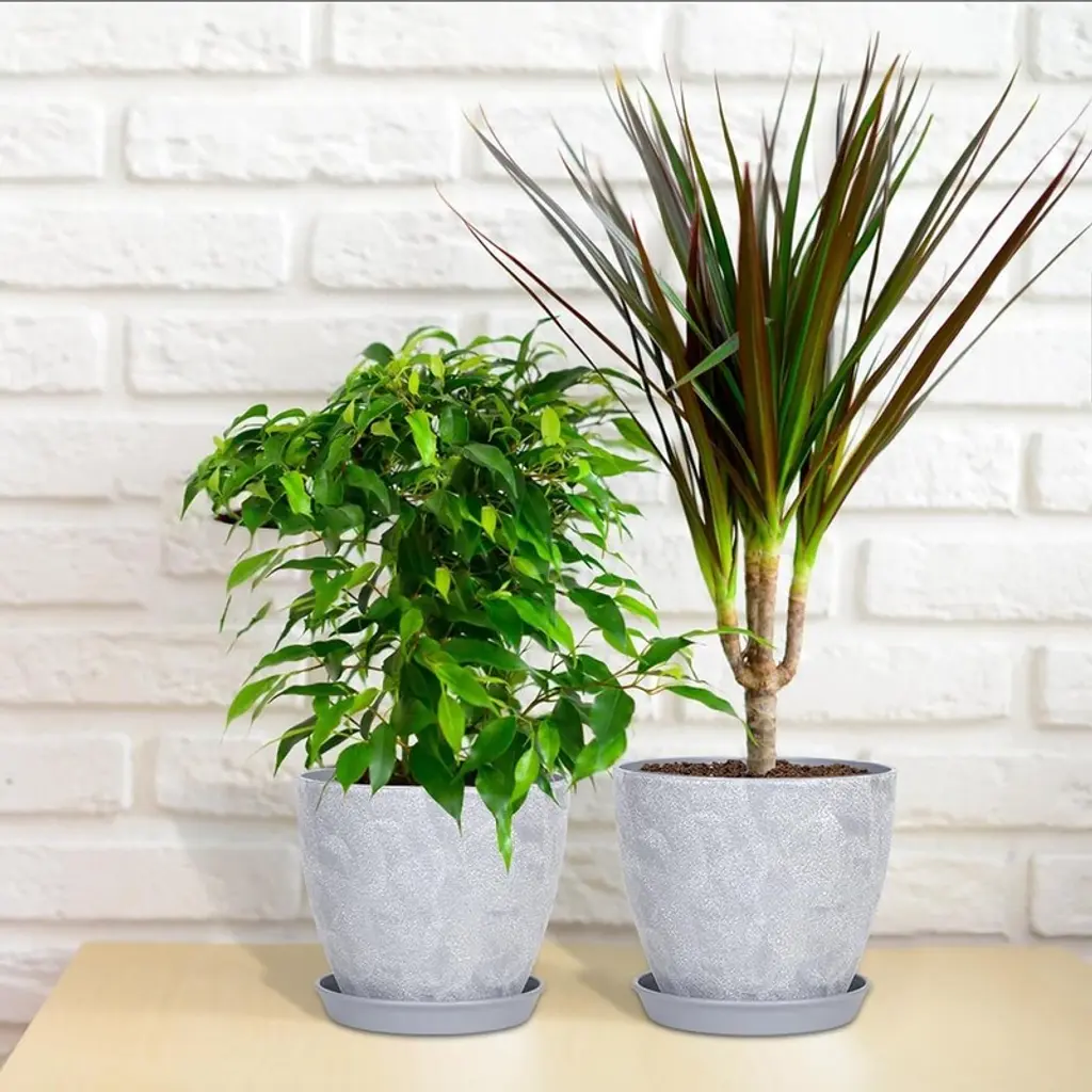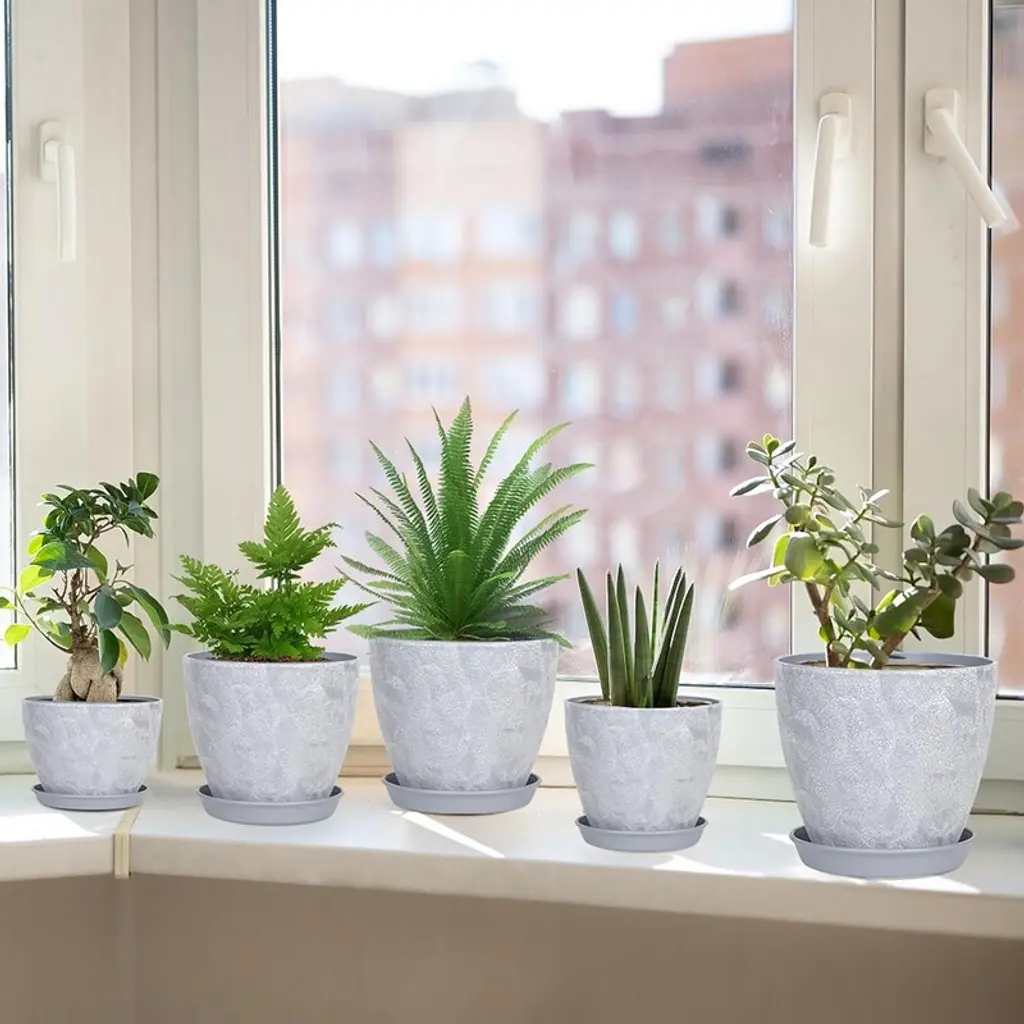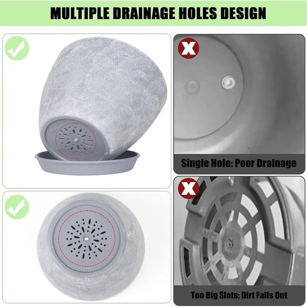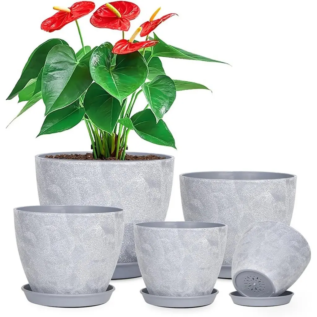 Different Size of Plant Pots: This set of plant pots has five sizes of 7.5/6.5/5.7/4.9/4.1 Inch, which are suitable for planting most small and medium-sized plants indoor or outdoor, adding different vitality to your home or office. Multiple Drainage Holes Design and Saucer: There are multiple drainage holes at the bottom of flower pots, which can drain excess water, allow the plant roots to circulate naturally, and reduce root diseases. The saucers can maintain proper moisture and help plants grow healthily. Perfectly Matched Saucer: Each size plant pot has a suitable saucer for water storage, which is more conducive to the healthy growth of plants. In addition, it can prevent water from spilling, keep the ground, table, window sill clean and dry. Sturdiness, High Quality Material, Odorless: Planters for indoor plants are made of 5 mm ultra-thick PP material. Lightweight, odorless, and durability, not easy to deform or break. These planters are perfect gardening gift for your mom, your father, or your friends who are plant lover. Minimalist Modern Style: Spray spots on the beautiful planter appearance, simple and distinctive. The minimalist and modern style can be a good decoration for your home and office. Choose a unique flower pot for your plants and flowers, which can be placed on the balcony or living room, bedroom, shelf, dining table, etc