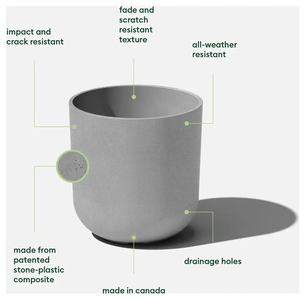 Soften up any room, patio or backyard with the Veradek Kona Planter''s curved edges and subtle textured finish. Complemented by its modern appearance, the Kona features pre-drilled drainage holes allow for planting a variety of different greenery such as flowers, tall trees or shrubs without having to worry about overwatering. This sturdy yet lightweight round planter is proudly crafted in Canada from a patented plastic-stone composite, making it resistant to cracks, fading and UV and allowing it to withstand extreme temperatures ranging from -20 to +120 degrees. With the ideal balance of design, structure and purpose, the Kona is the perfect way to enhance any indoor or outdoor space, every season.