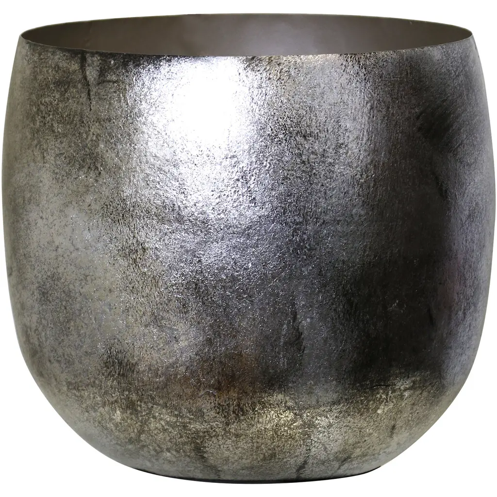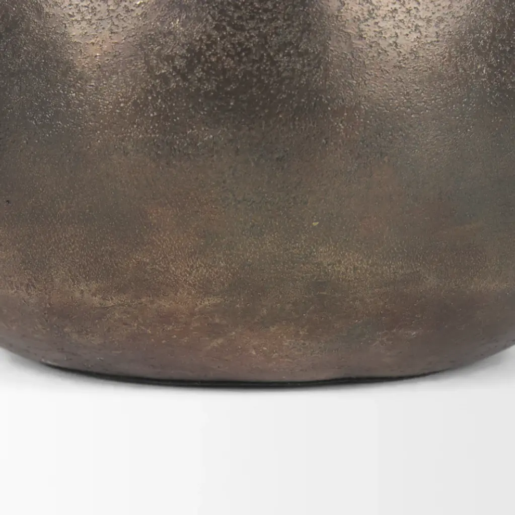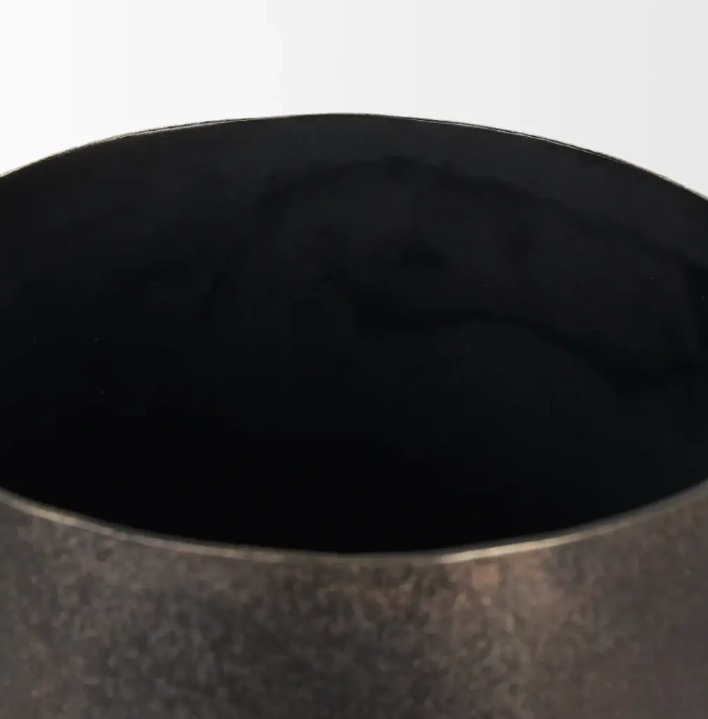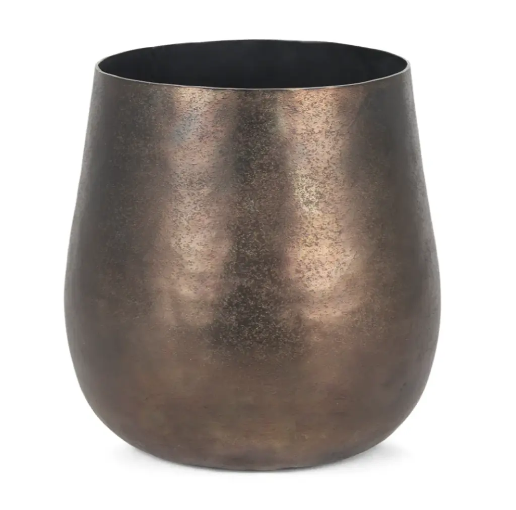 Enhance your décor with the Quade metal planters, crafted from solid cast aluminum and featuring organic textures highlighted by an antiqued gold finish. These planters are not water-sealed, intended for artificial or dried botanicals. Water and moisture may cause the metal to rust.