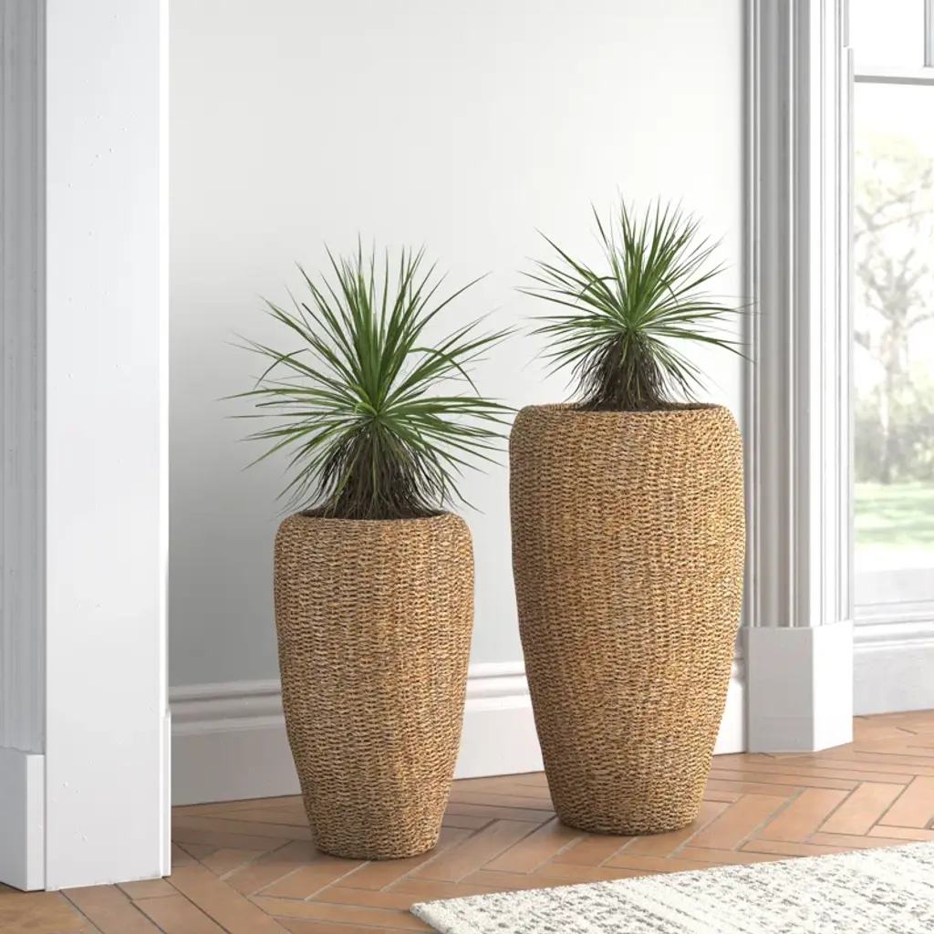 This 2-piece set of planters adds an extra earthy vibe to your indoor palms and peace lilies. They're made from seagrass that's been woven around a wire frame, and their warm brown hue freshly contrasts your green foliage (sold separately). Plus, the over-scaled height makes these planters great for taller trees and long faux fronds. Pro-tip: Keep your live plants in a plastic pot set inside the planter to protect your floors from dirt spills.