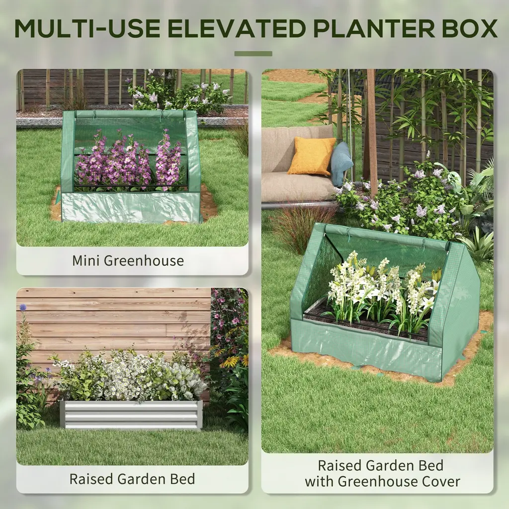 Warm tips: Product after-sales guide 🚀Thank you for purchasing our products!Please do not return the product in case of problems. Please take a photo and send it to us, we will quickly process and provide a reasonable solution. Thank you for your cooperation! 🙏2-in-1 Raised Planter Greenhouse: This outdoor garden bed set includes a raised planter and a outdoor greenhouse you can use as a cover for it. Provide vegetables twice the help or use either separately.Mini Green House Cover: The included mini greenhouse protects plants from cold, wind, excessive rain, and UV scorching. It locks in humidity and creates a barrier so birds can't get in from above.Please bury the 4" edges of our greenhouse for an optimal seal.Galvanized Raised Garden Bed: Our raised planter bed lets you set down soil even if you don't have a yard. Galvanized steel is water-safe, and a raised bed keeps out weeds while nursing plants with special soil.Open Bottom Bed: Let plants reach their potential. Our galvanized raised planter features an open bottom that drains away excess water and lets long-rooted plants reach further down for more nutrients.Galvanized Raised Garden Bed with Greenhouse Cover Info: Small Greenhouse Dimensions: 49.25" L x 37.5" W x 36.25" H. Garden Bed Dimensions: 47.25" L x 35.5" W x 11.5" H.