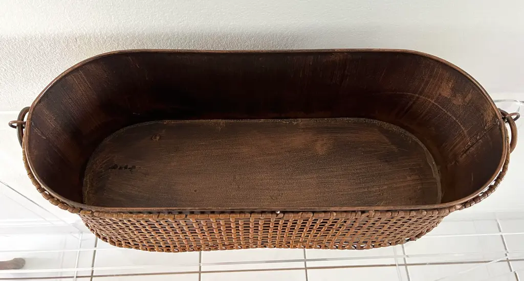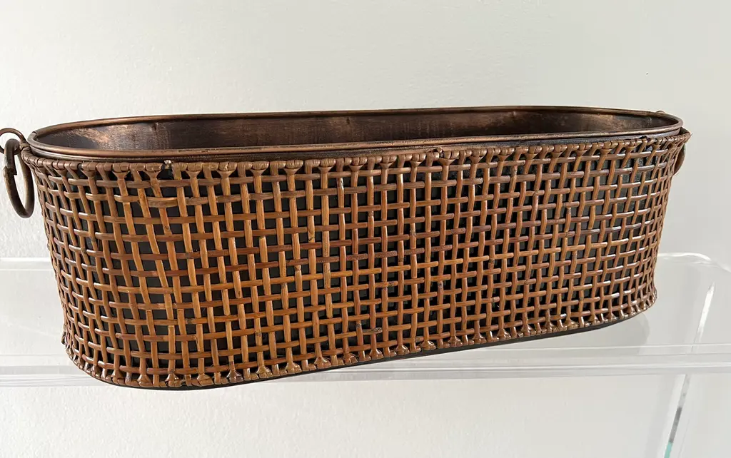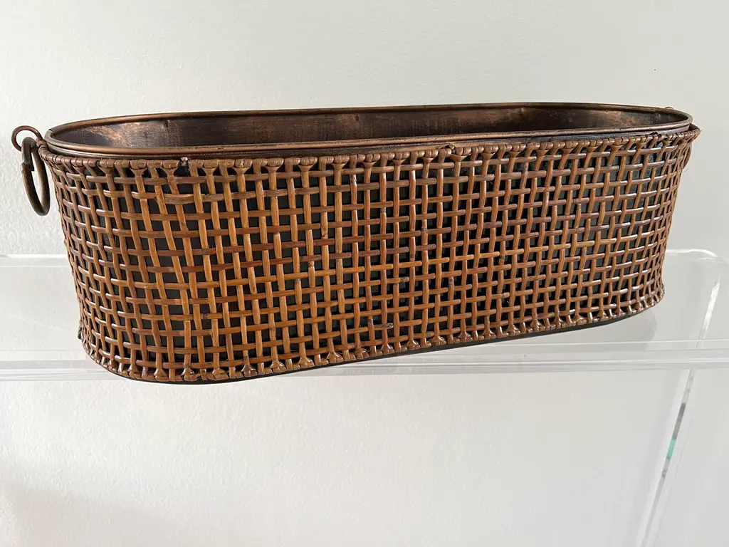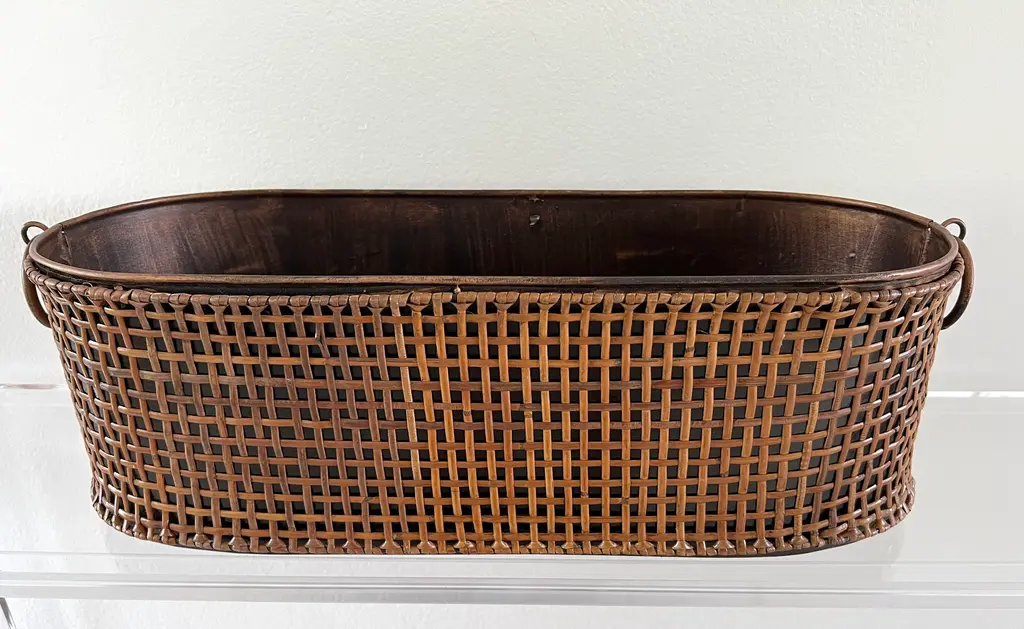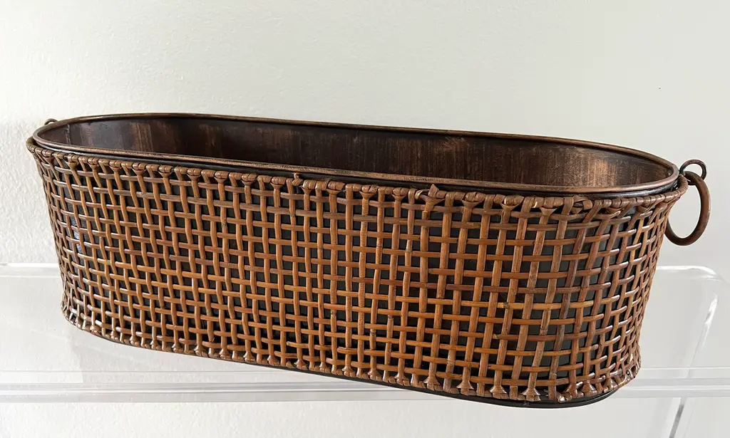 Gorgeous Rattan Wrapped Long Metal Planter with Round handles on each size. Rattan is wrapped around entire planter. There are two available.