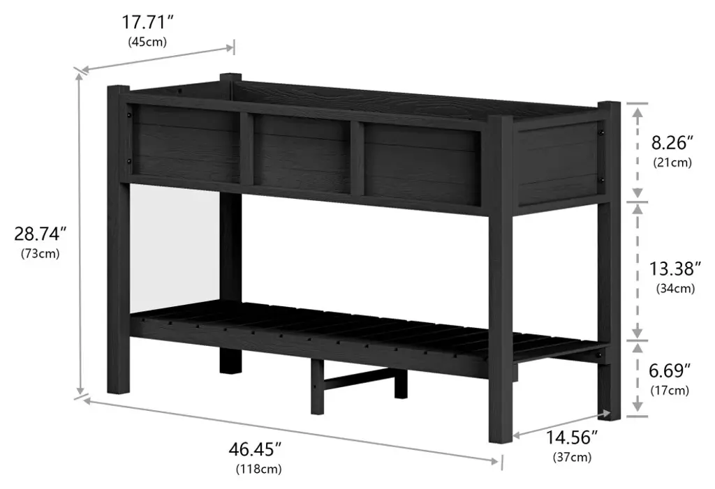 Specifications:Style: FarmhouseMaterial: Plastic WoodColor: Cyan & Black & WhiteShape: RectangularProduct Dimensions: 46.45" D x 17.71" W x 28.74" HMounting Type: Floor StandingIndoor/Outdoor Usage: OutdoorNumber of Pieces: 1Assembly required: YesFeatures:�Rustic Design】The farmhouse and natural style flowerbed has a depth of 8.26 inches, which provides enough deep breathing for plants and vegetables, healthy growth, and does not require frequent watering.�Stable and Durable】This garden bed ensures durability, which is stable and durable enough to strongly support the weight of the garden bed itself and the plant.�Easy Installation】All accessories and instructions are included in the package, so you can better assemble and protect your hands. The product is easy to make, the overall size is 46.45" D x 17.71" W x 28.74" H, and the depth of the pot is 8.26 inches.�After-Sale Sevice】If you are not satisfied with the product you purchased from us, don''t hesitate to get in touch with us, and we will provide you with satisfactory solutions.�Wide Application】Suitable size made it fits perfectly on your patio, balcony, deck, or even inside of the house, and it will make it easy to enjoy planting everywhere.