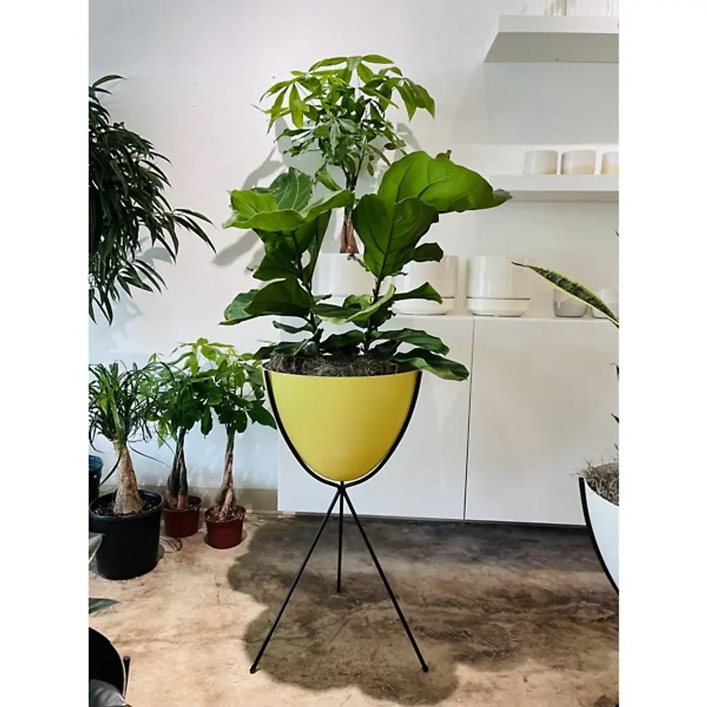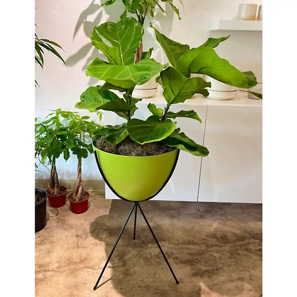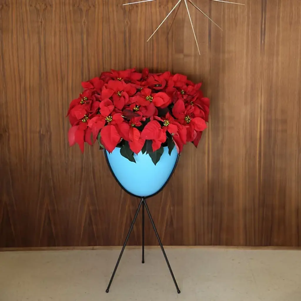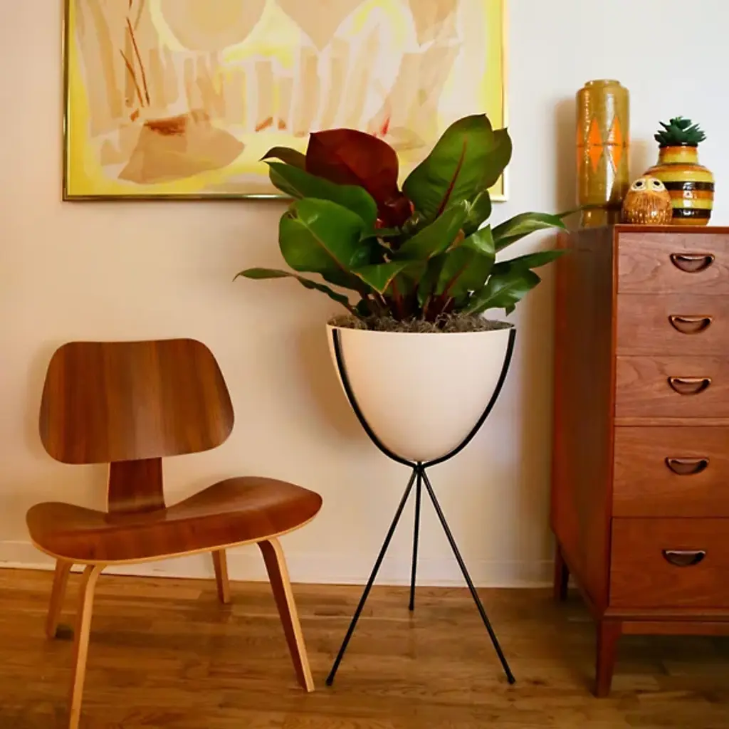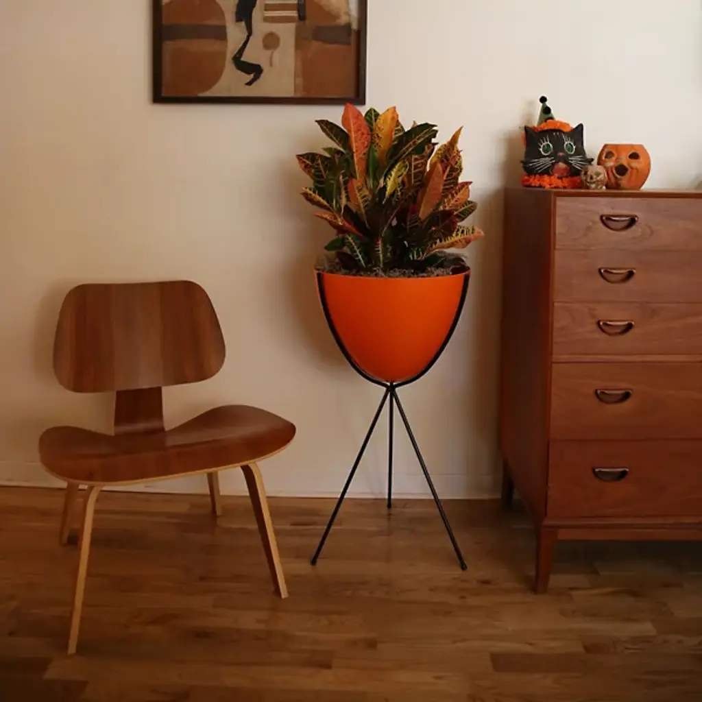 Mid-century modern for the 21st century. The Hip Haven Retro Bullet Planter has the same shape and is made using the same materials as the vintage 1950s originals. The bowl is compression-molded out of lightweight, colorful fiberglass, its rounded conical form held upright by a black steel tripod stand. Use as a planter, ice bucket or storage indoors or in protected outdoor areas.