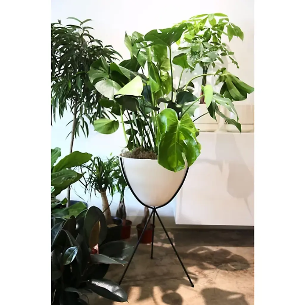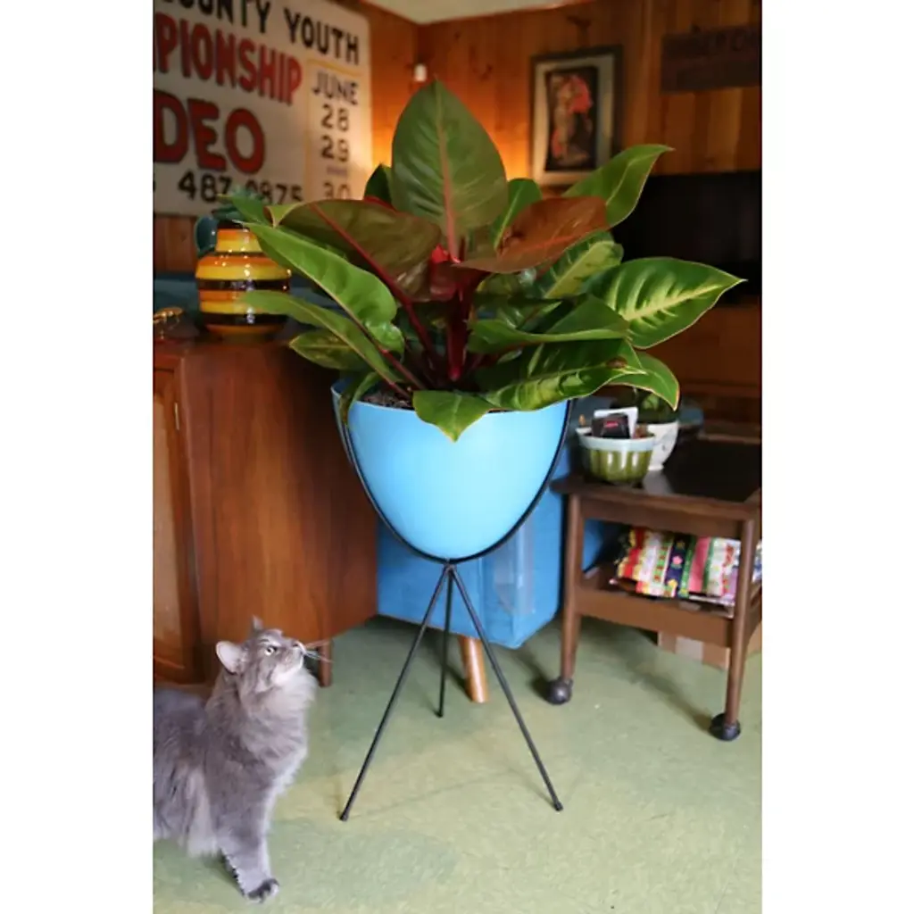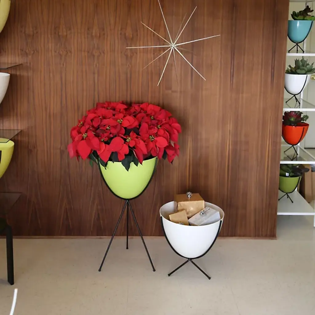Mid-century modern for the 21st century. The Hip Haven Retro Bullet Planter has the same shape and is made using the same materials as the vintage 1950s originals. The bowl is compression-molded out of lightweight, colorful fiberglass, its rounded conical form held upright by a black steel tripod stand. Use as a planter, ice bucket or storage indoors or in protected outdoor areas.