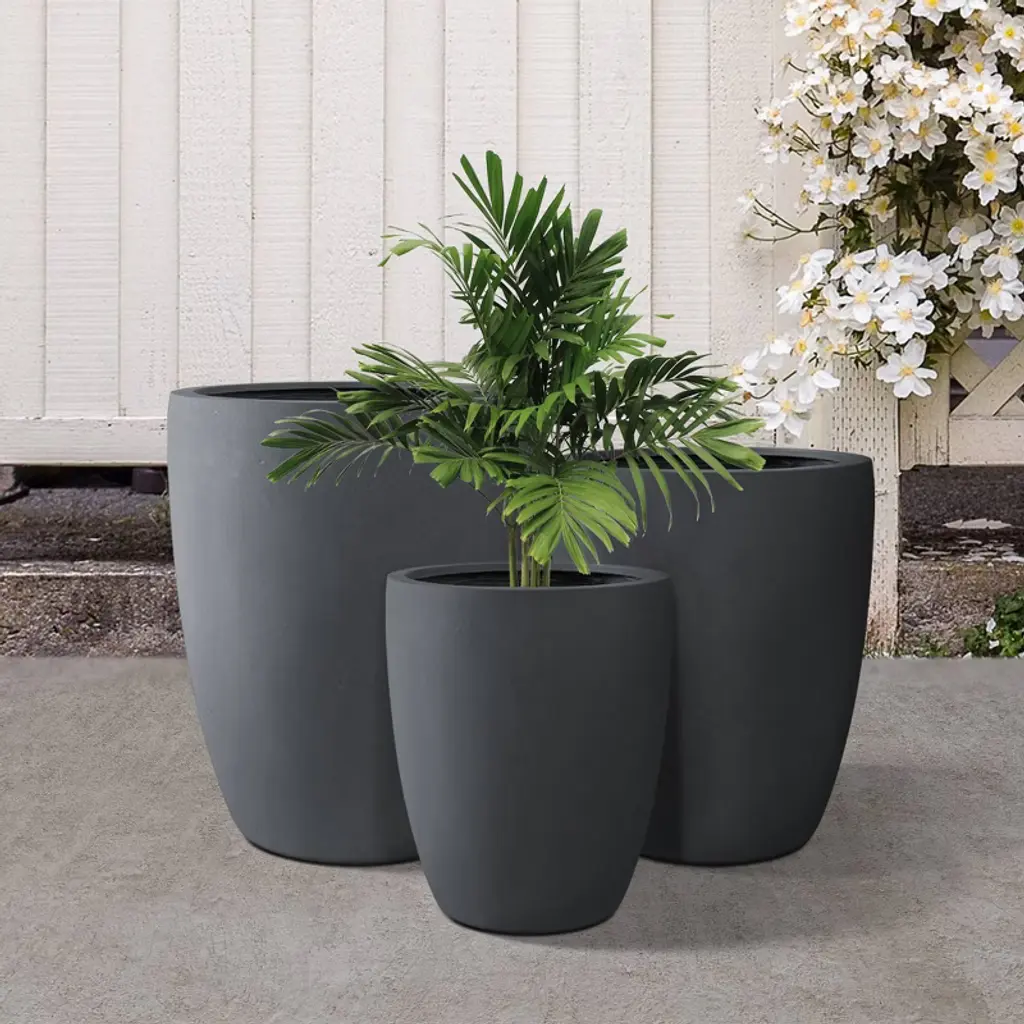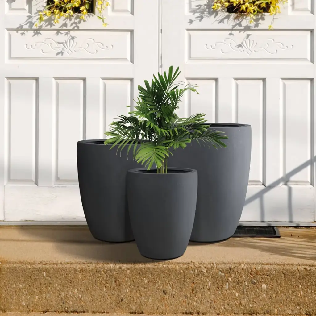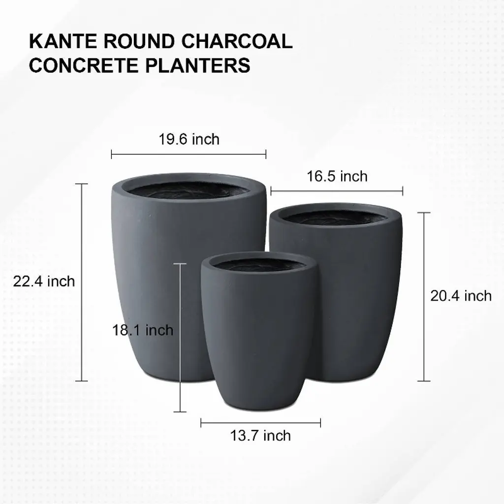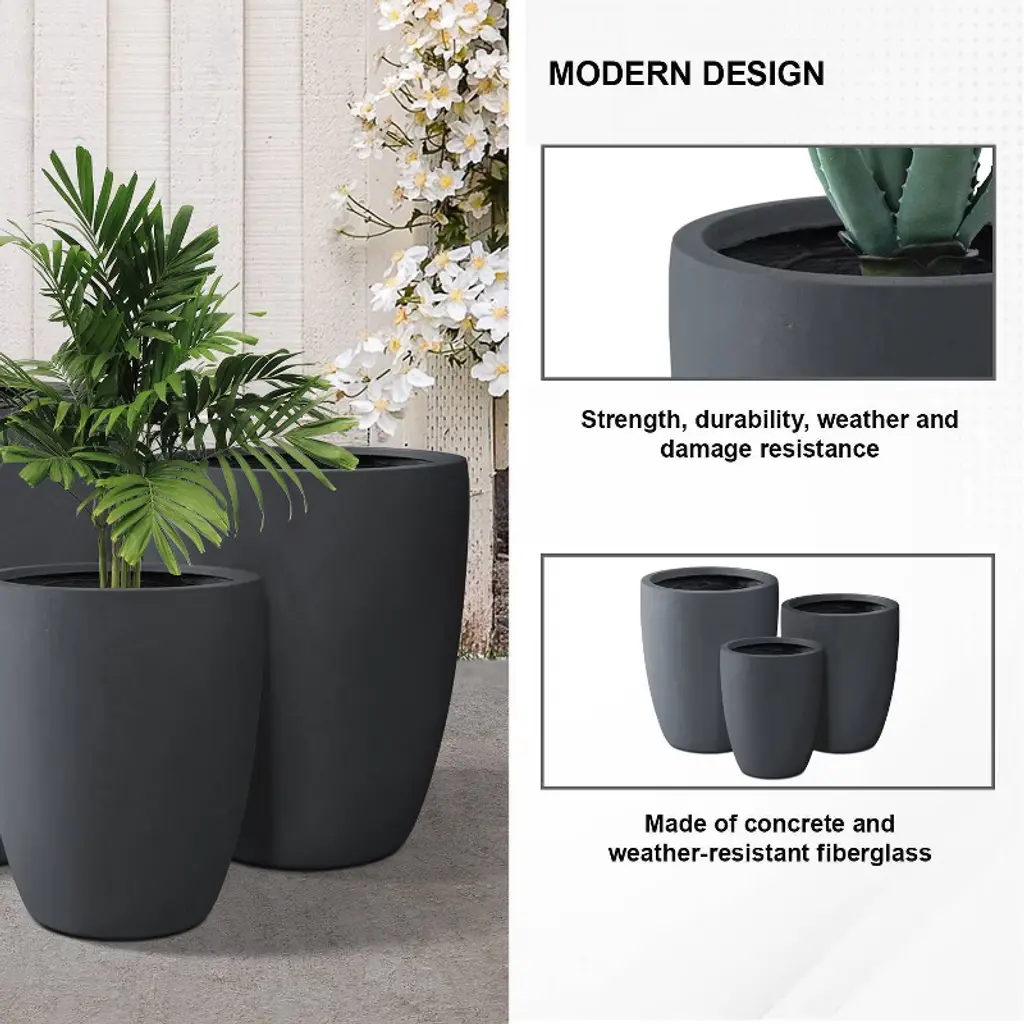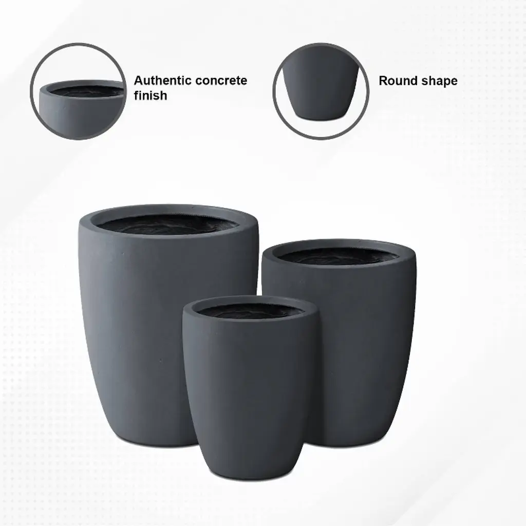 These elegant tall planters feature an authentic concrete-inspired finish with subtle natural pores, giving them a sophisticated modern look that instantly elevates any space. Designed to replicate the beauty and texture of real concrete, they remain surprisingly lightweight for easy movement and repositioning, while their smooth, polished surface offers a refined alternative to traditional rough pots. Generously sized to allow plants to thrive without appearing overcrowded, they are perfect for statement greenery or decorative arrangements on patios, balconies, gardens, or indoors. The versatile gray finish complements any décor style, while their tall, sleek silhouette works beautifully as individual accents, paired sets, or a cohesive row for a designer-inspired display. Expertly crafted from a durable blend of lightweight concrete and weather-resistant fiberglass using an eco-friendly process, these planters deliver the strength of traditional concrete with enhanced resilience against UV rays, rain, wind, heat, and cold—providing lasting performance and timeless elegance season after season.
