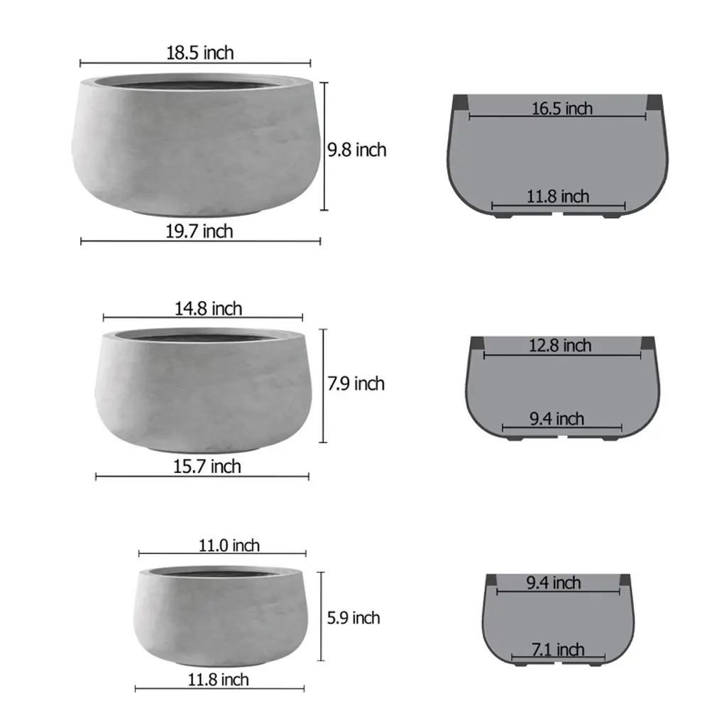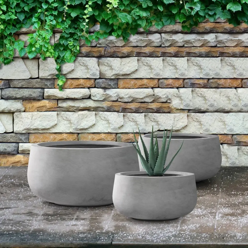 The Kante round planter set in natural concrete finish offers a seamless design that adds elegance to any indoor or outdoor space. This lightweight set of three planters is weather-resistant and includes built-in drainage holes to promote healthy plant growth. Their modern style fits effortlessly into various settings, from garden decor to patio accents. The durable construction ensures they can withstand outdoor elements while maintaining their sleek, contemporary look. Perfect for enhancing any garden or home with practical and aesthetic appeal, these planters offer versatility in use and design. Whether you're using them for outdoor plants or indoor decor, these planters provide both functionality and style, making them an essential addition to any space.