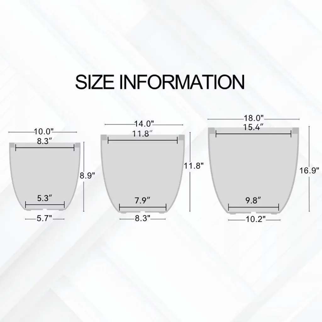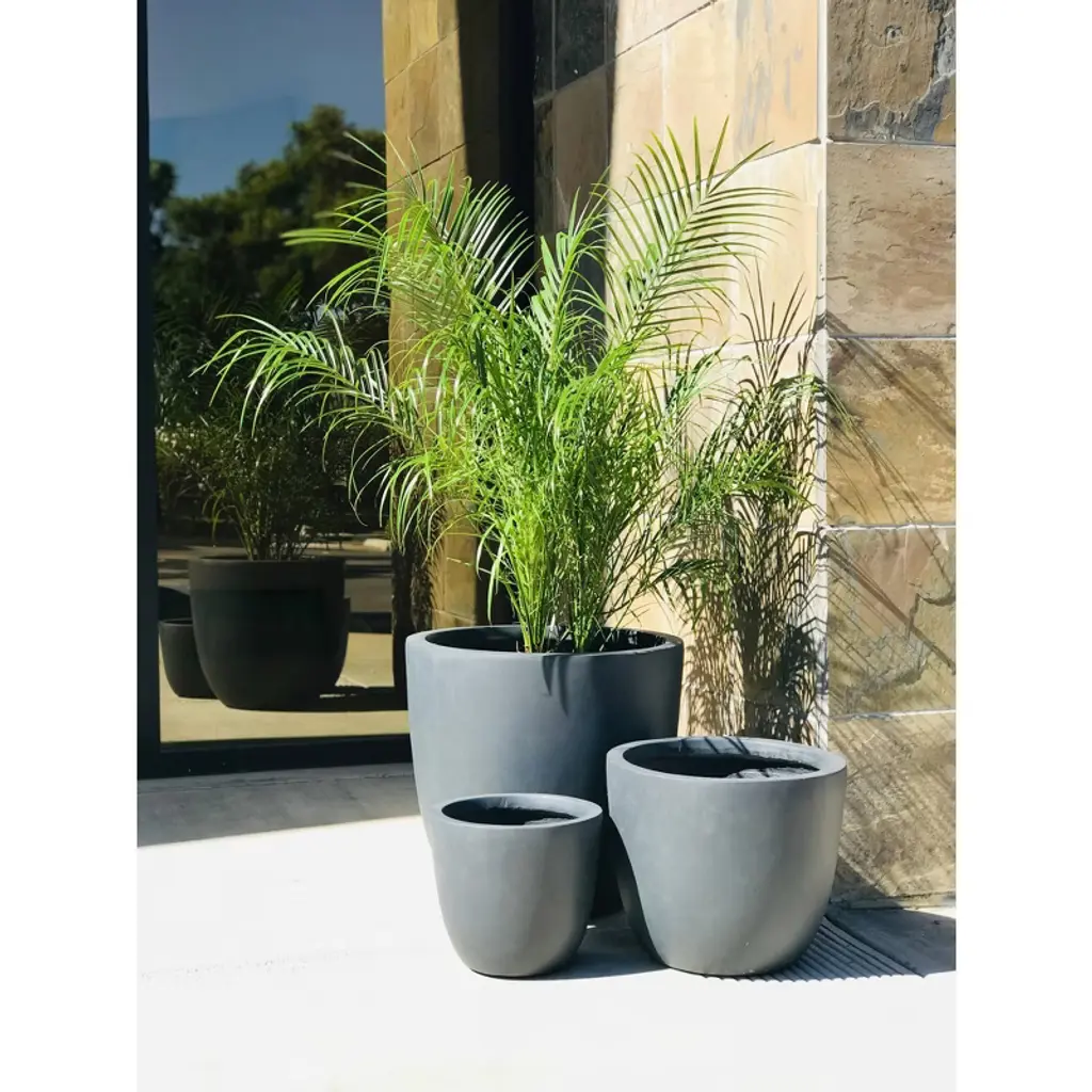 These elegant round planters have authentic concrete finish with visible pores make them beautiful contemporary pieces. The look and feel is true concrete but it weights substantially less than it looks. It also has a very smooth finish instead of rough concrete potters you might be used to. The size is very generous and can hold a good amount of plants without looking crowded. Would look great on an apartment balcony or large backyard patio. The smooth lines and round shape of these planters will help you maintain a modern design throughout your space. You can’t go wrong with the grey finish as it blends well with any décor. They can be used individually, as a set or in a row to promote unity. Made of lightweight concrete through an ecofriendly manufacturing process. This composite material has no rubber, plastic, and steel. This material has all the advantages of concrete such as strength, durability, weather and damage resistance. Materials involve cement and weather-resistant fibe