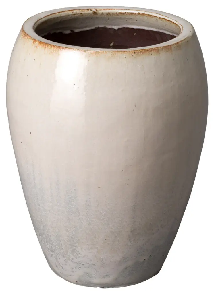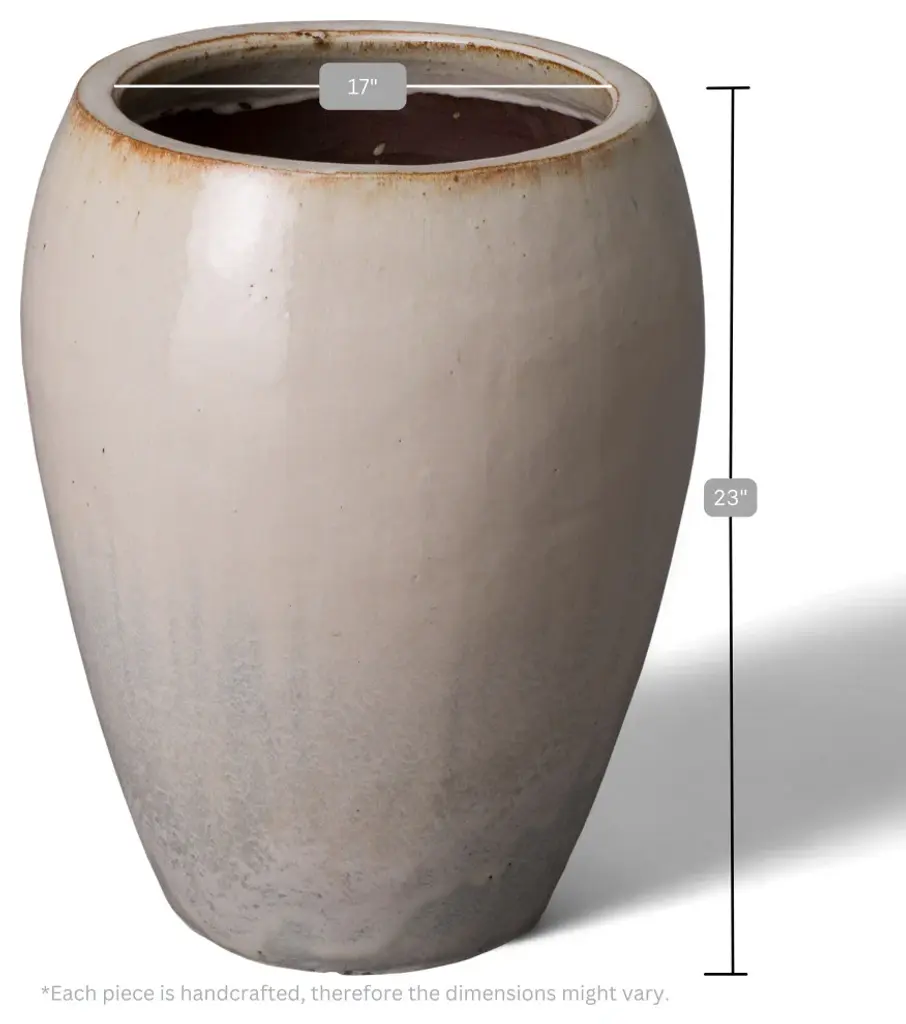 This round ceramic pot is handcrafted and finished in a glossy off-white glaze. Made from heavy and durable red clay, this pot is suitable for use both indoors and outdoors. The pot is 17 inches in diameter at its widest point just below the mouth and gently narrows as the piece reaches the floor. This simple and versatile pot is the perfect addition to any contemporary or traditional living space.