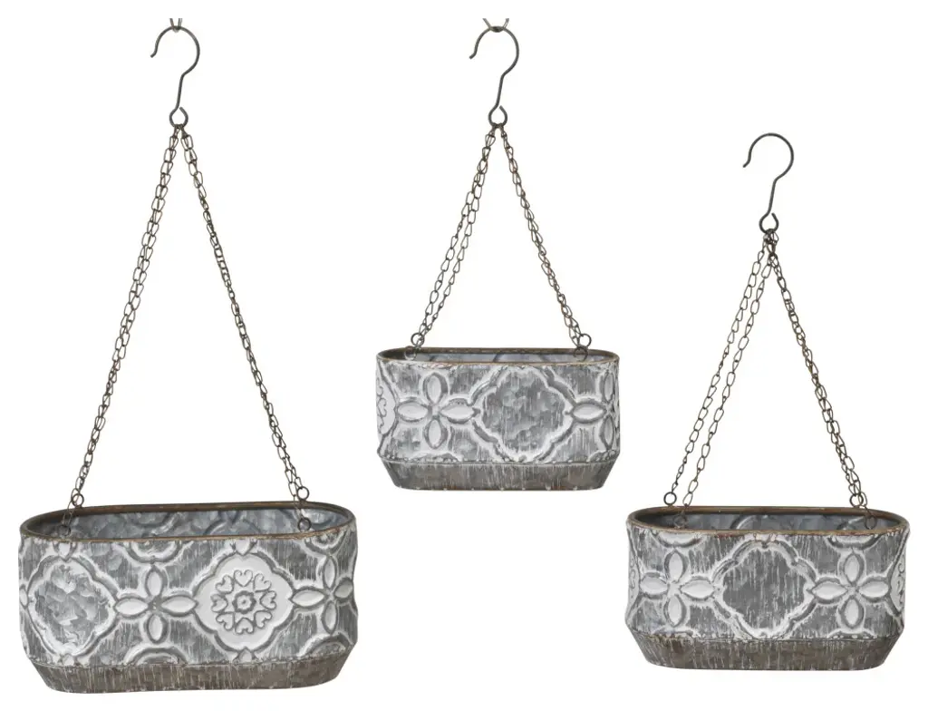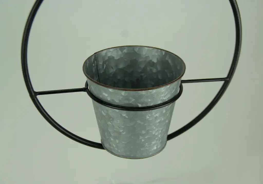 OVERALL SIZE - 11.5 Inches in Diameter, 5.5 Inches WideMade of a Metal with a Rope and Metal Ring Hanger at the TopDistressed Blackened Frame Beautifully Contrasts the Silver-Grey Galvanized Finish of the PlantersArrange Small Fresh or Faux Flower Bouquets, Display Greenery, Tall Grasses or Trailing PlantsUnique Hanging Design Lets You Use them Indoors or Outdoors and You Can Hang them From Just About AnythingA modern design with a rustic farmhouse look, this decorative hanging planter set works in any decor environment. A pair of simple galvanized metal planters are beautifully displayed inside black metal rings to bring your plants to new decorative heights. Hang them anywhere from the built-in rope and metal ring hangers. They work great with trailing plants and tall grasses or arrange small bouquets of colorful fresh or faux flowers. This set of 11.5-inch diameter, 5.5-inch wide hanging planters brings a unique look to any decor setting.