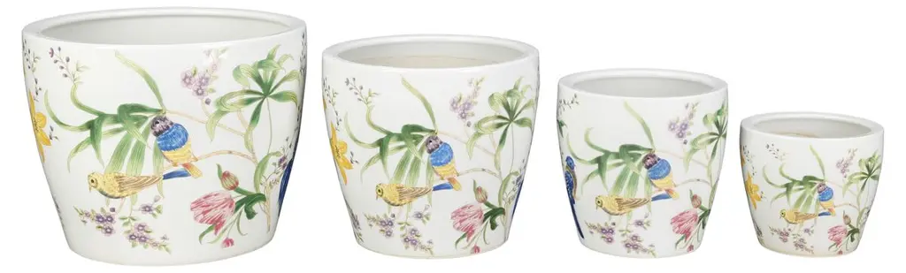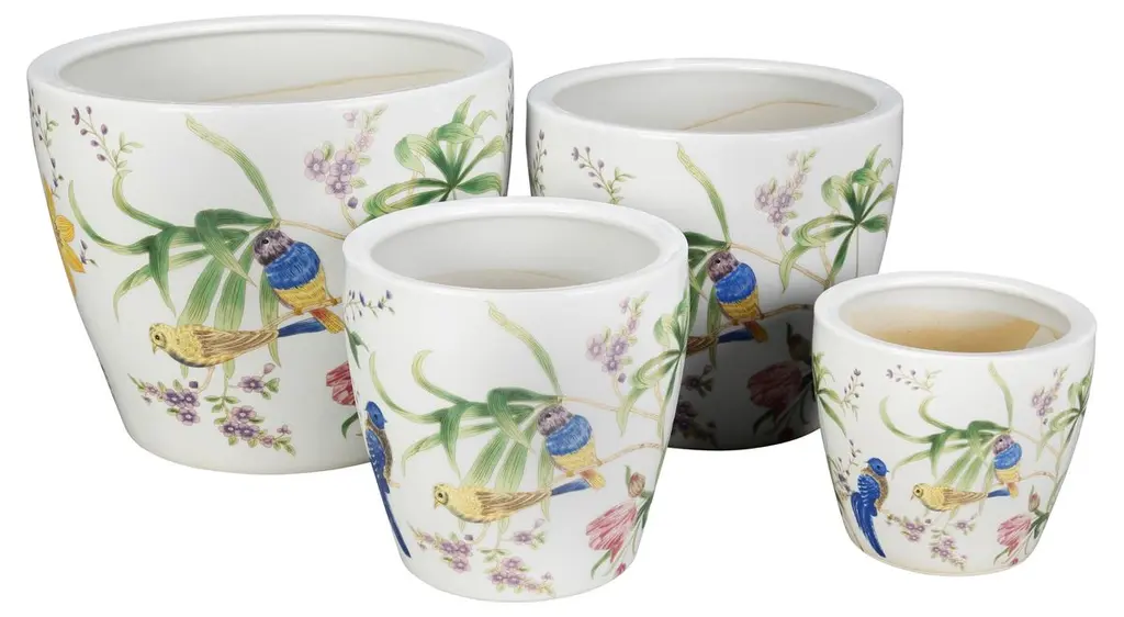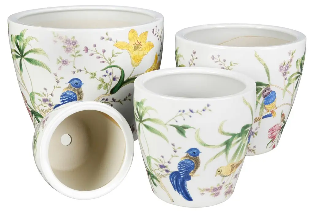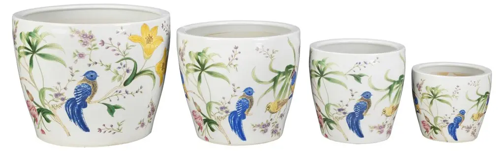 The four ceramic planters, each a different size, that make up this set look fabulous grouped together or scattered throughout your home. The colorful birds and blooms adorning them are sure to brighten their surroundings (and your mood).