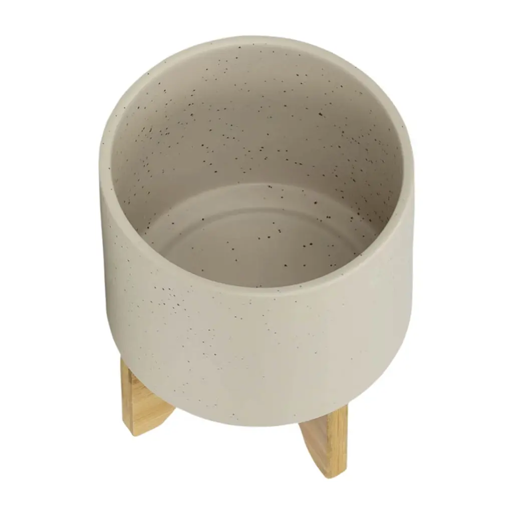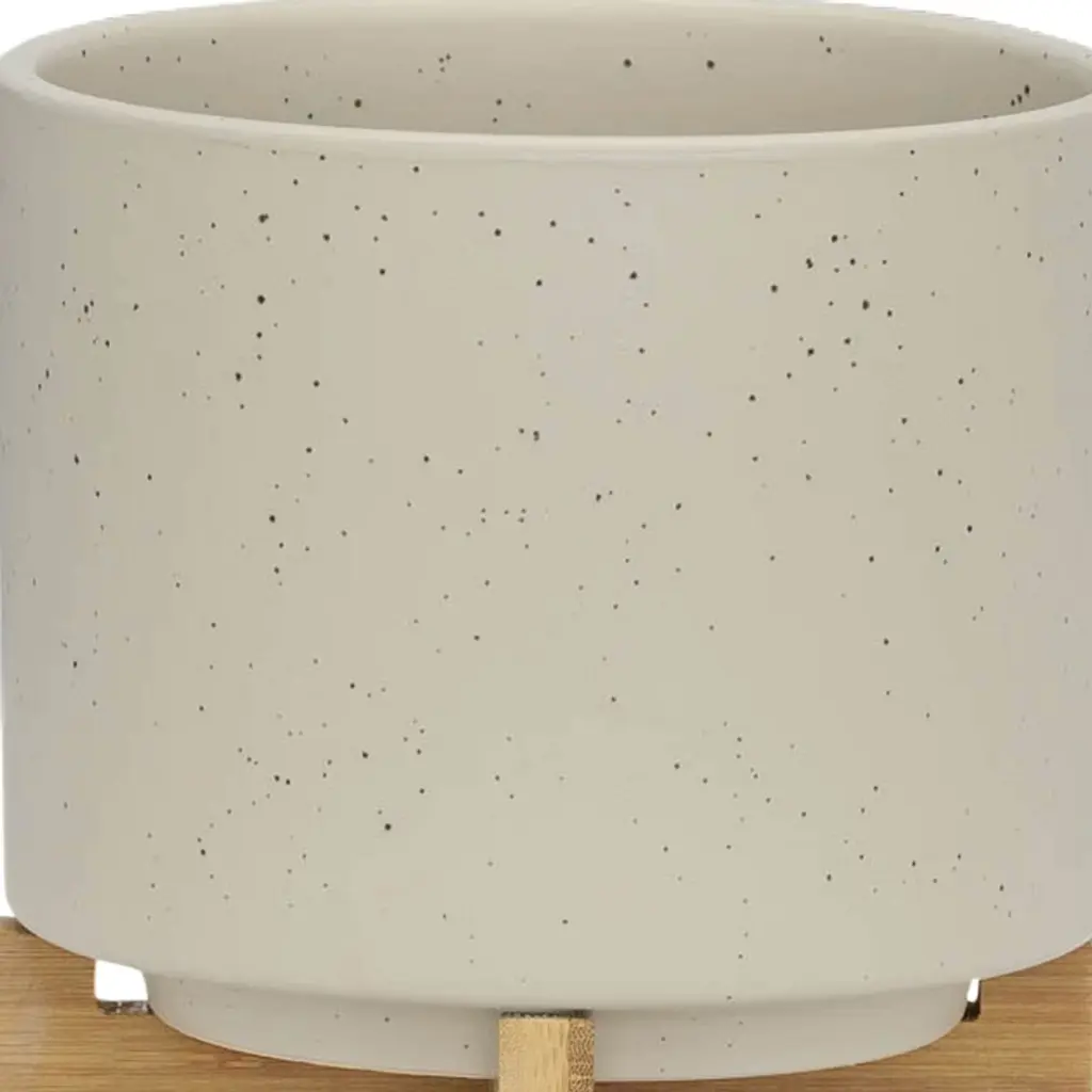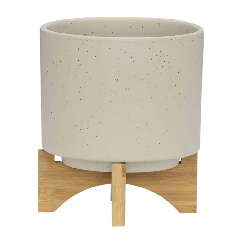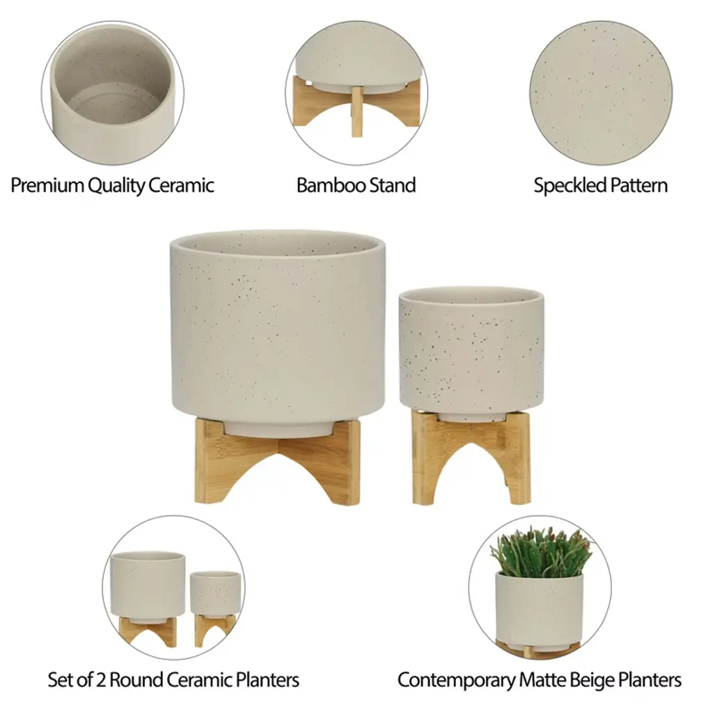 Include items in your home that will be sure to stand the test of time! This ceramic planter set is simply designed and comes in a classic matte beige color that will never go out of style, even as trends come and go. This set includes two planters in varying sizes sitting atop bamboo stands, ready to help you show off your favorite succulents, small plants and cacti. Use these high quality planters in any indoor or outdoor space!