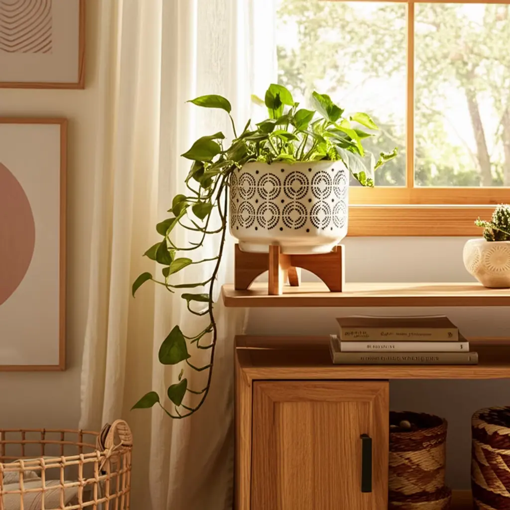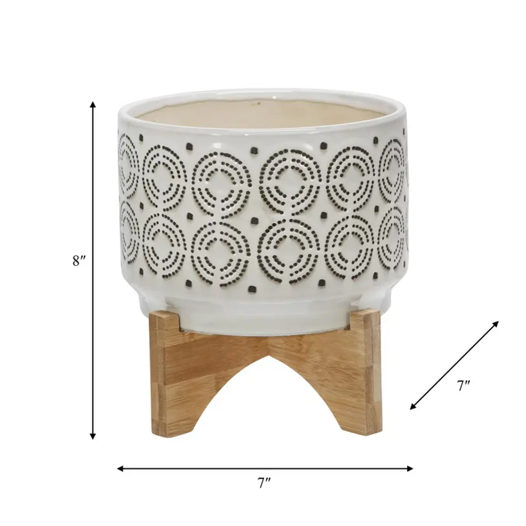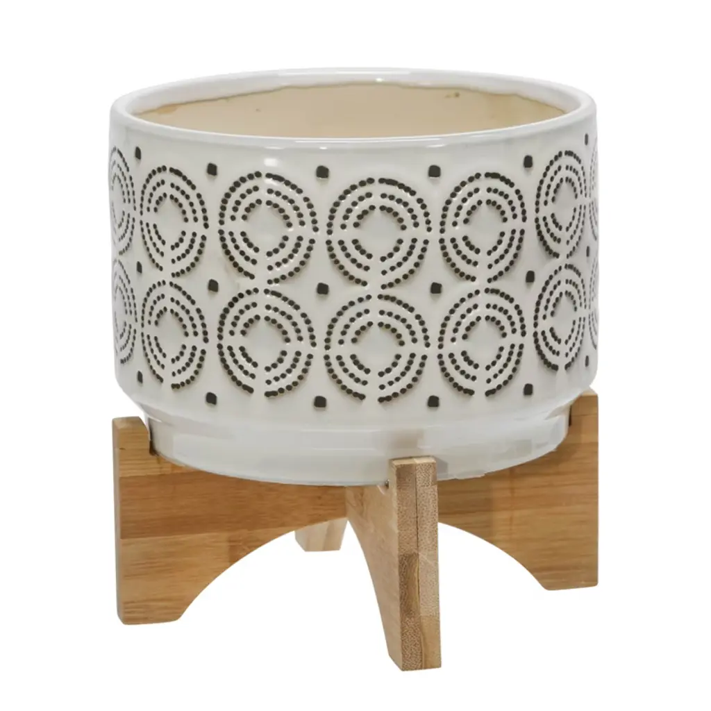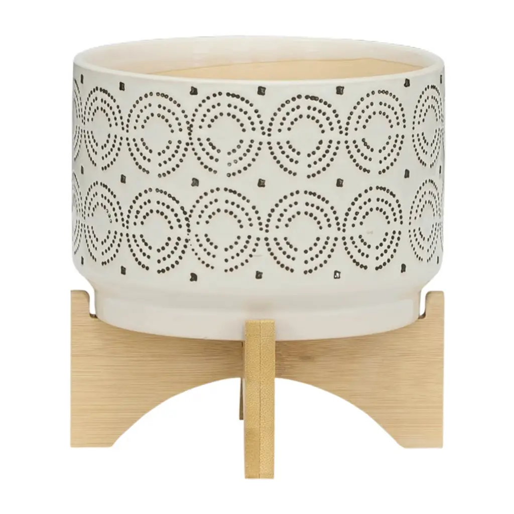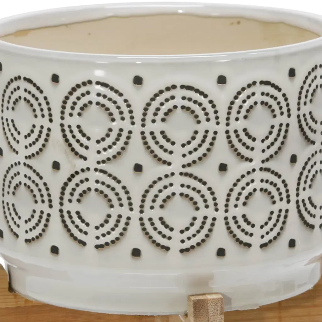 Introduce a touch of elegance to your indoor or outdoor spaces with Sagebrook Home's Swirl Pattern Planter on a Bamboo Wood Stand. This stunning planter combines the classic beauty of ivory and gray ceramic with the natural charm of bamboo, featuring an elegant swirl pattern that adds visual interest to your Decor. The ivory and gray ceramic planter is a perfect complement to your arrangements. This planter provides ample room for your plants to thrive and grow, while the bamboo stand elevates your plants, adding height and dimension to your display while also offering a sturdy and durable support structure.