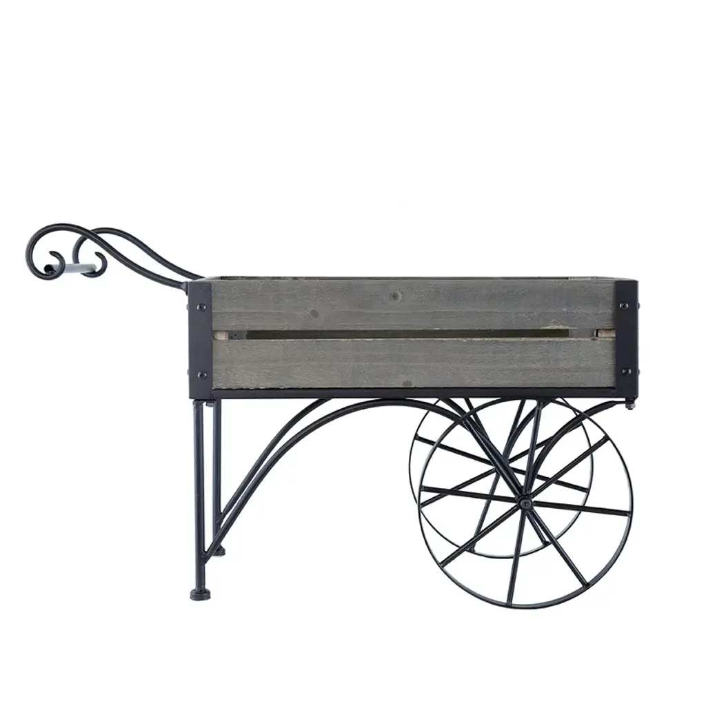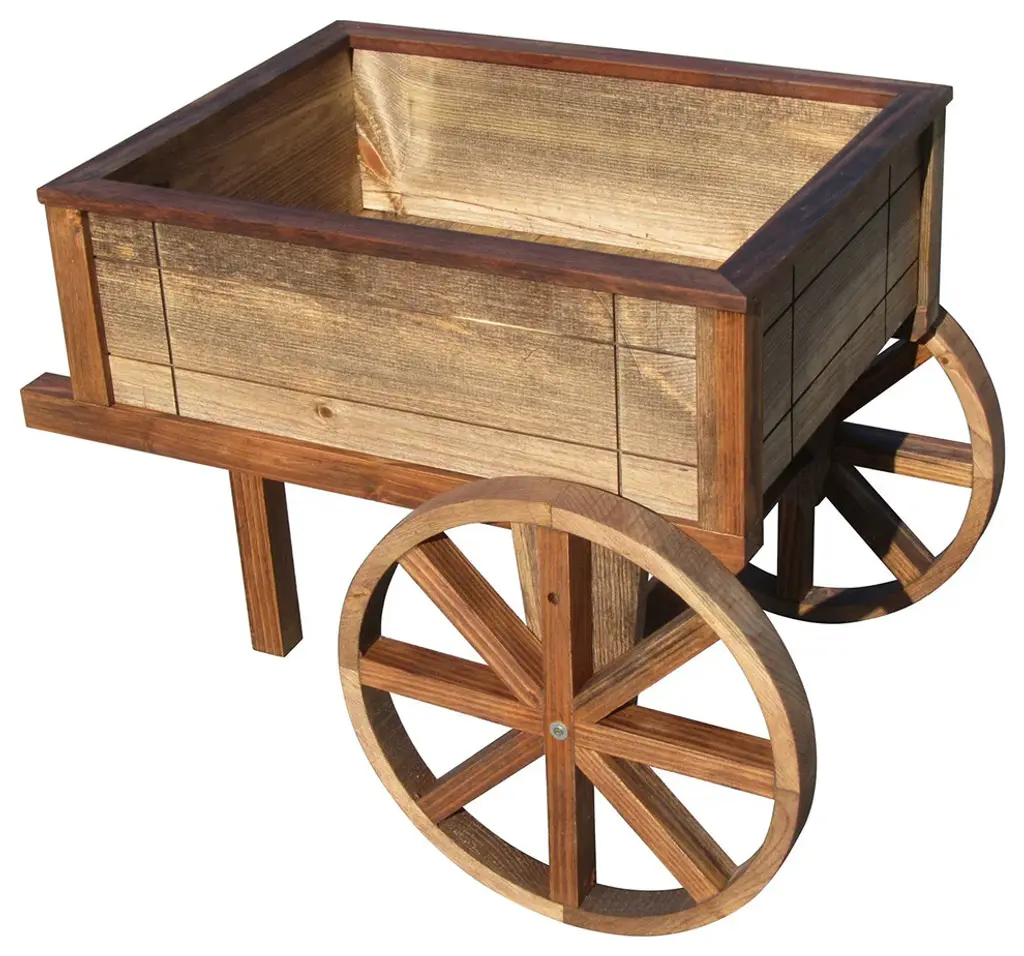 This wooden flower cart planter will make a dazzling accent piece to show off your favorite plants. Wheels are decorative and do not turn. . Highlight your favorite flowers in style.. Made in the USA, superb craftsmanship, and labor of love.. Treated with oil based semi-transparent green wood preservative, ready to finish to your liking; the color will turn lighter over time.. The planter box is 24-1/2"L x 9-1/2"H x 18-1/2"W (62 cm L X 24 cm H X 47 cm W.) and has a drain hole at the bottom.Easy assembly with a screw driver.