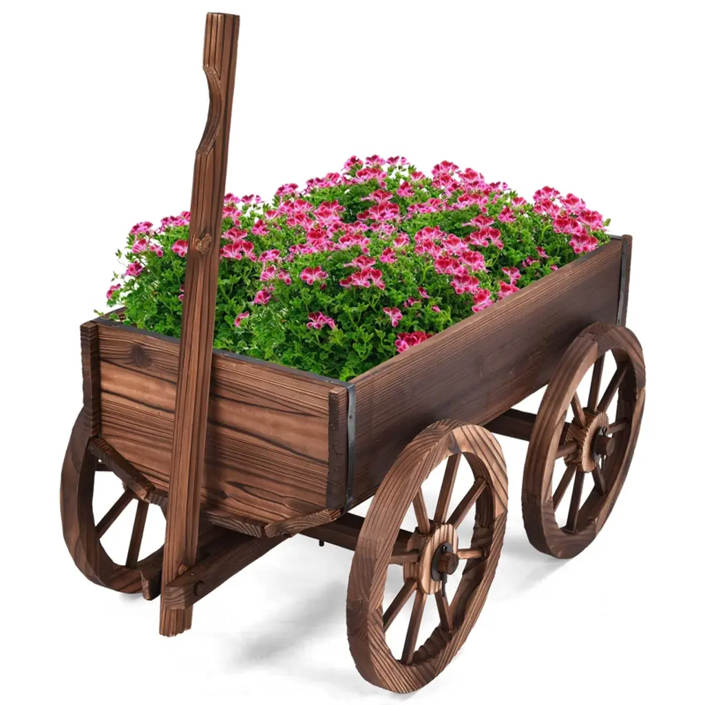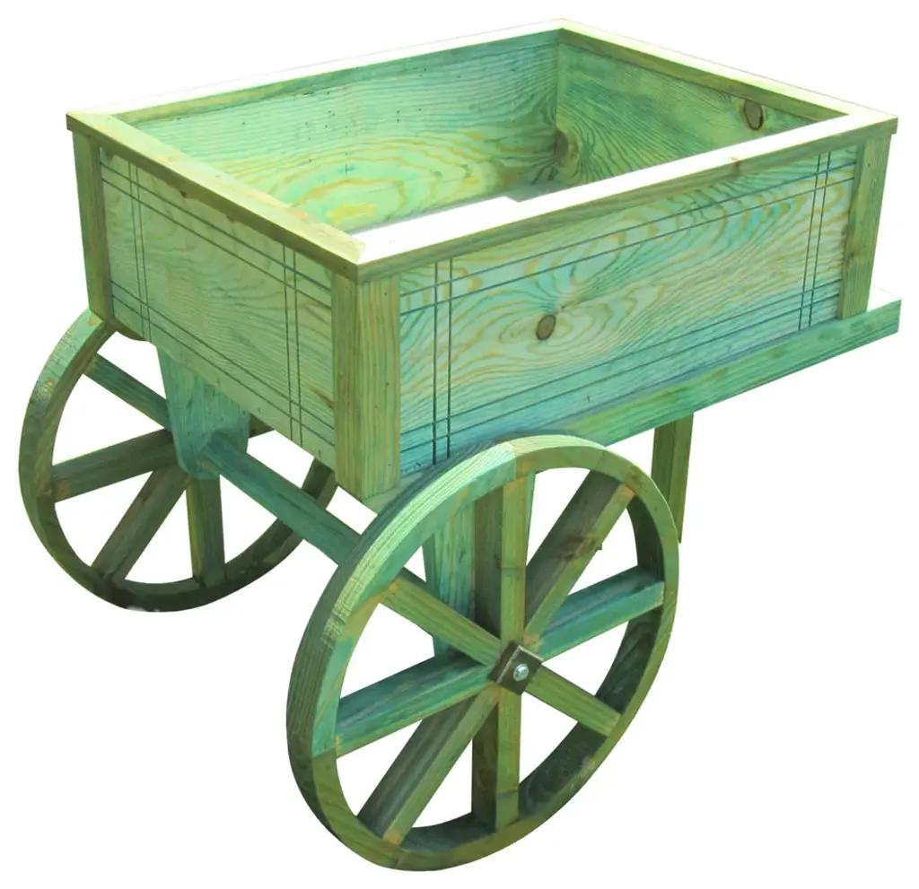 This wooden flower cart planter will make a dazzling accent piece to show off your favorite plants. Wheels are decorative and don''t turn. . Highlight your favorite flowers in style.. Made in the USA, superb craftsmanship, and labor of love.. Treated with semi-transparent green wood preservative, ready to finish, or leave as is for a rustic look.. The planter box is 24-1/2"L x 9-1/2"H x 18-1/2"W and has a drain hole at the bottom.. Easy assembly.