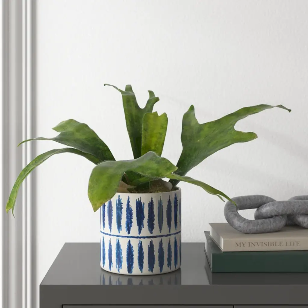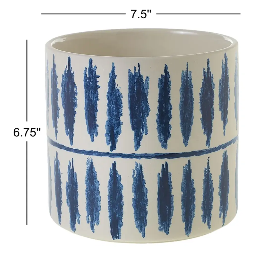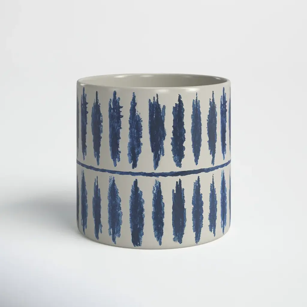 A simple shape and hand-painted design in the blue combine in the playful yet modern
