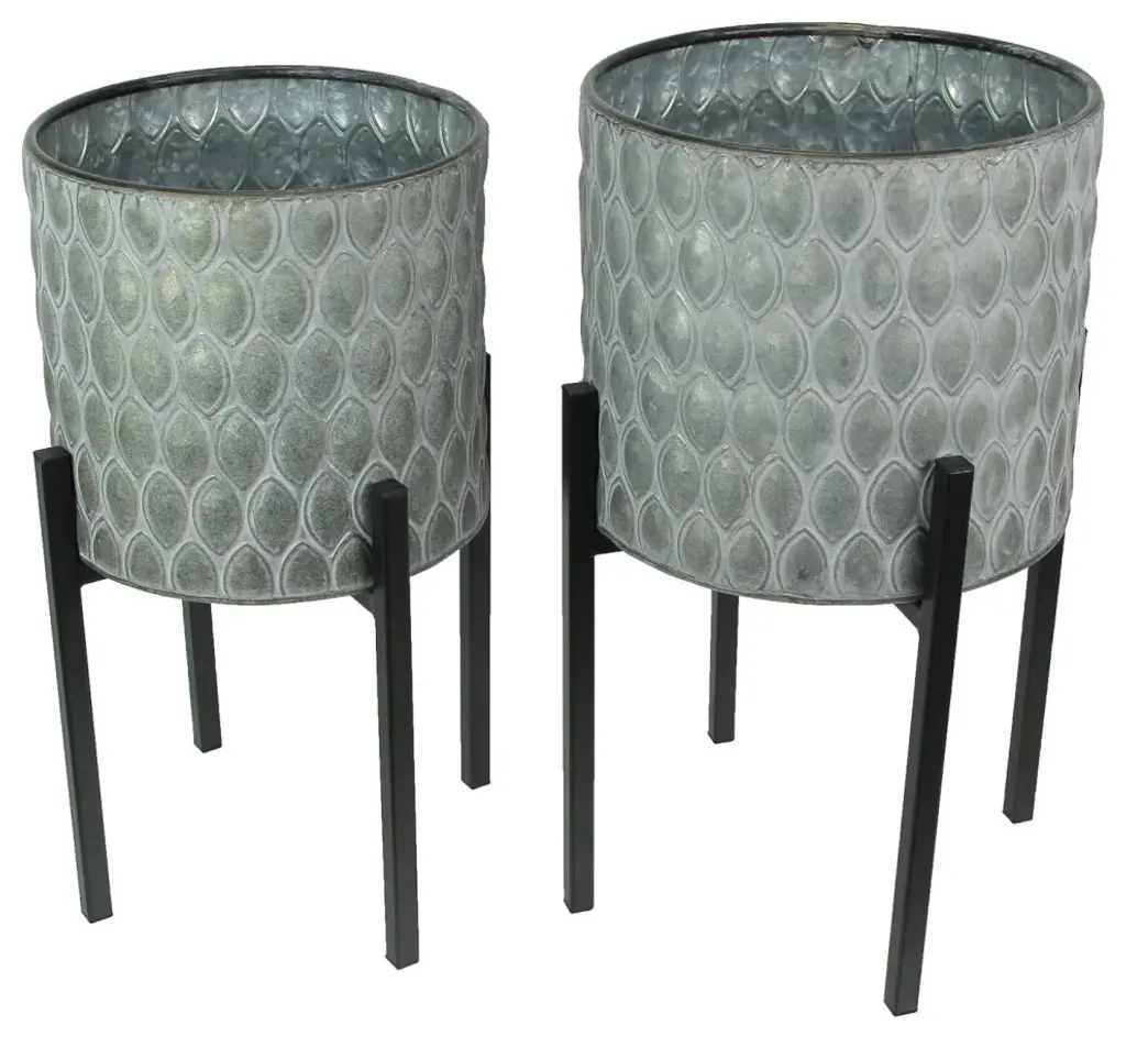 Set Of 2 Galvanized Zinc Finish Leaf Pattern Metal Planters With Wooden Stands