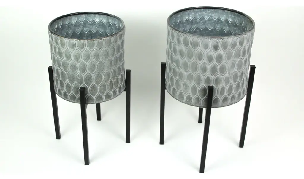 OVERALL SIZE - Large - 20 Inches High, 11.25 Inches in Diameter. Small - 19 Inches High, 10 Inches in Diameter.DURABLE MATERIAL - Crafted of Sheet Metal with Wooden Stands For Years of Maintenance Free DisplayBEAUTIFUL FINISH - Matte Galvanized Zinc Coating for a Great Farmhouse LookNATURAL DESIGN - Beautiful Petal Stamped PatternGREAT GIFT - For Yourself or For Friends and FamilyThis set of 2 metal pail-style planters features a petal-like lens-stamped pattern. Made from sheet metal, the planters have a matte galvanized zinc finish for a great farmhouse look, and come with wooden three-post stands. The larger planter measures 20 inches high, and 11.25 inches in diameter, and the smaller one is 19 inches high, and 10 inches in diameter. They are great for houseplants, herbs, or artificial ornamental plants. They do not have a drainage hole. Give your room, porch, or patio a touch of natural charm with these wonderful planters.