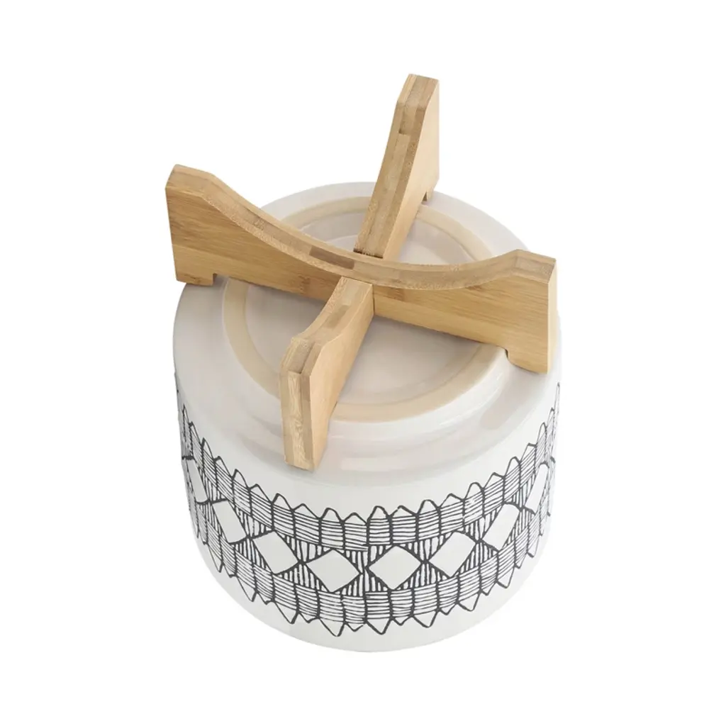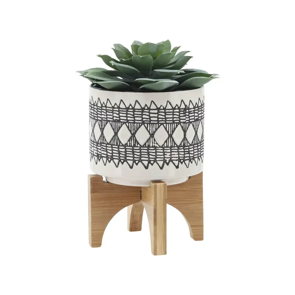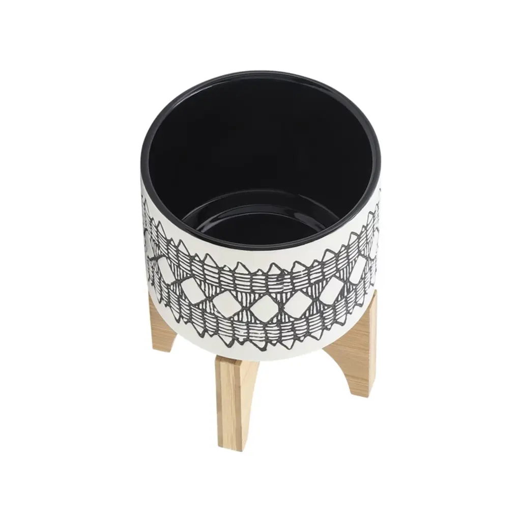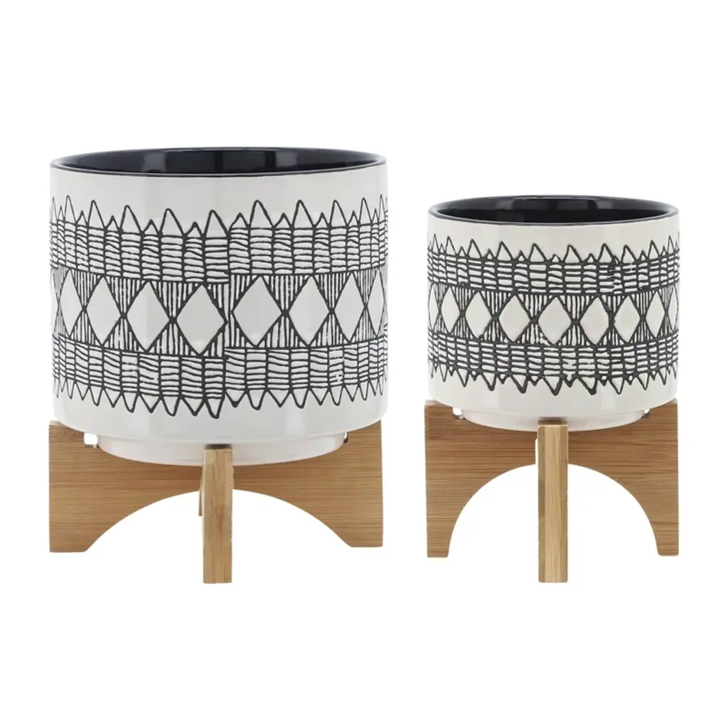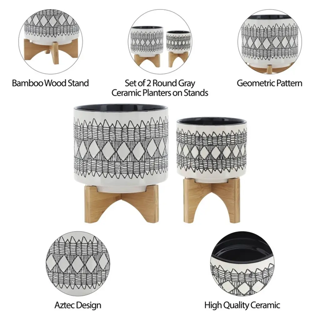 Set Of 2 Geometric Ceramic Planters On Wooden Stand Gray - Sagebrook Home: Indoor/outdoor Decorative Pot Set