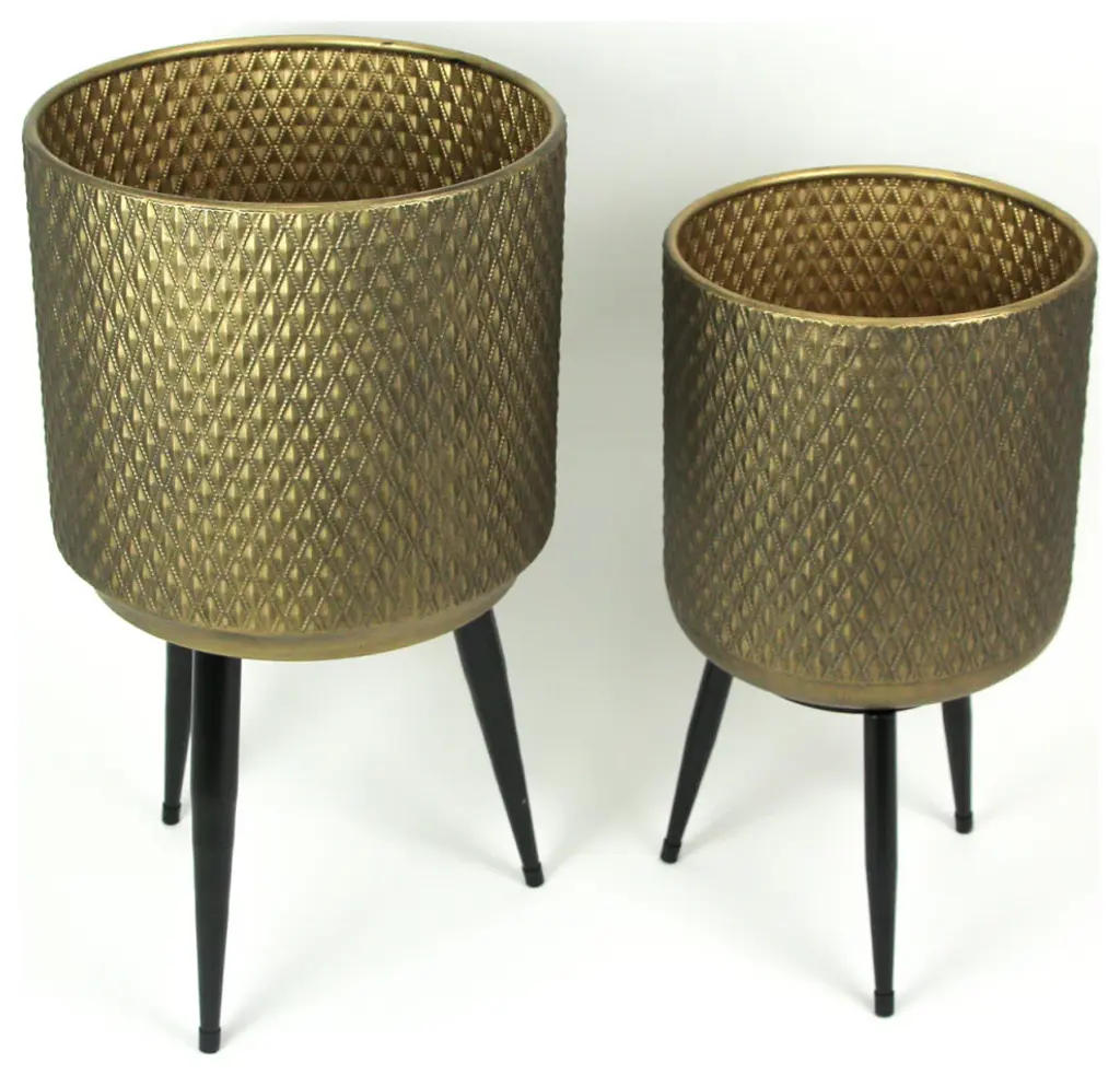 OVERALL SIZE - Large - 21.5 Inches High, 12 Inches in Diameter. Small - 18 Inches High, 10 Inches in Diameter.DURABLE MATERIAL - Crafted of Sheet Metal with Coated Black Metal Stands For Years of Maintenance Free DisplayBEAUTIFUL FINISH - Metallic Gold Coating for an Elegant LookCLASSIC DESIGN - Geometric Diamond Stamped PatternWONDERFUL GIFT - For Yourself or your Plant Loving FriendsThis set of 2 metal pail style planters features a pinnate leaf stamped pattern. Made from sheet metal, the planters have a metallic gold finish for an elegant look, and come with metal three-post stands. The larger planter measures 21.5 inches high, 12 inches in diameter, and the smaller one is 18 inches high, 10 inches in diameter. They are great for houseplants, herbs or artificial ornamental plants. They do not have a drainage hole. Give your room, porch or patio some added class with these wonderful planters.