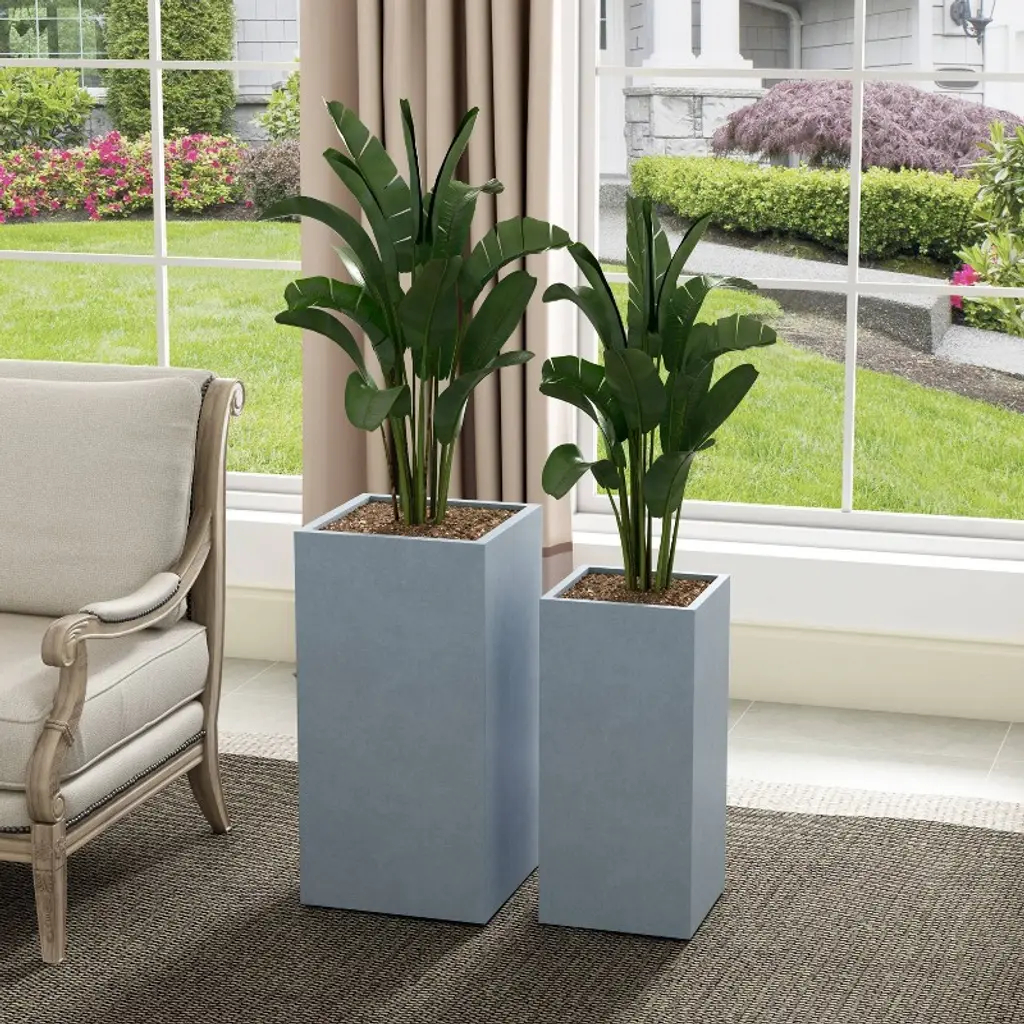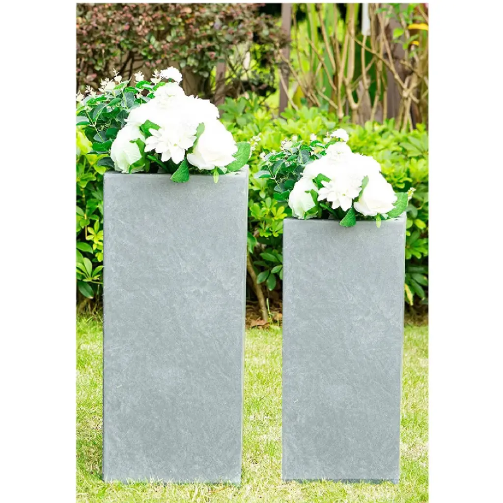 These elegant square planters have authentic concrete finish with visible pores make them beautiful contemporary pieces. The look and feel is true concrete but they weight substantially less than they look. They also have very smooth finish instead of rough concrete potters you might be used to. Their sizes are very generous and can hold a good amount of plants without looking crowded. They do have a more modern feel to them being straight lines and concrete. They would look great on apartment balcony or large backyard patio. In modern design, less is more. These square planters can be used symmetrically with trailing plants or in a variety of beautiful landscape designs. Made of lightweight concrete through an ecofriendly manufacturing process. This composite material has no ruber, plastic, and steel. This material has all the advantages of concrete such as strength, durability, weather and damage resistance. Materials involve cement and weather-resistant fiberglass. This material has