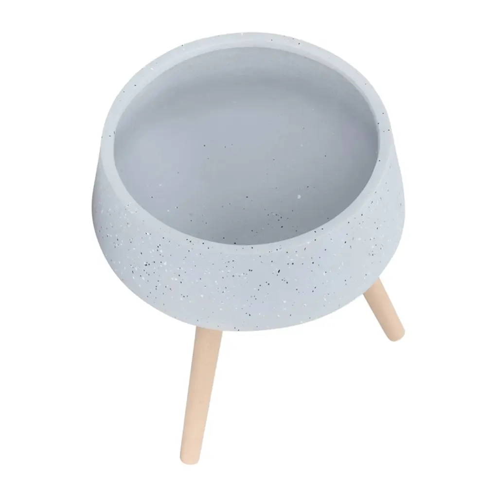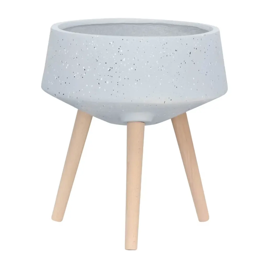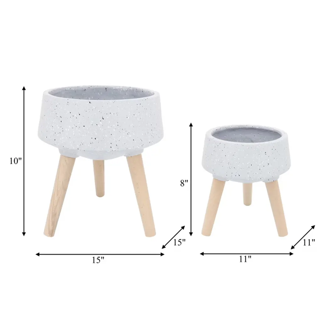 Set Of 2 Modern Resin Planters With Stands - Speckled Magnesia Pots & Beech Wood Legs - Indoor/outdoor Decorative Plant Holders - 10", 8" Gray