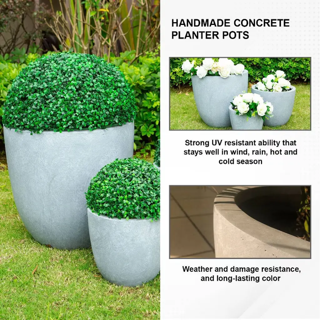 These stylish round planters showcase an authentic concrete finish with subtle natural pores, giving them a refined, contemporary edge that instantly elevates any space. Designed to capture the look and feel of real concrete while remaining lightweight, they are easy to move and arrange as needed, with a smooth polished surface that offers a sleek, high-end alternative to traditional rough pots. Generously sized to provide ample room for plants to thrive, they’re perfect for apartment balconies, garden pathways, or spacious backyard patios, adding a clean, sophisticated look wherever placed. Their rounded silhouette and versatile gray finish complement any décor style, making them equally striking as standalone accents, grouped together for layered impact, or lined up for a cohesive, designer-inspired display. Expertly crafted from an eco-friendly composite of cement and weather-resistant fiber—without rubber, plastic, or steel—these planters deliver the durability, strength, and all-season resilience of concrete in a lighter, more practical design. Built to withstand sun, rain, wind, and cold, they combine lasting performance with timeless modern elegance for both indoor and outdoor spaces.