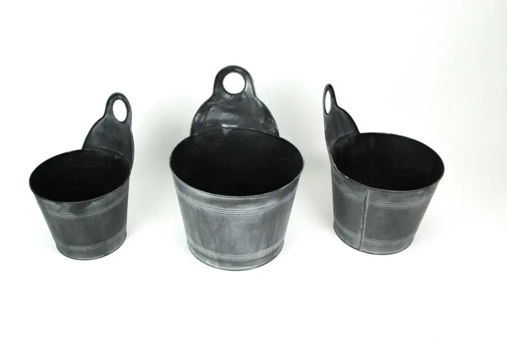 Set Of 3 Charcoal Gray Finish Metal Bucket Style Hangable Planters