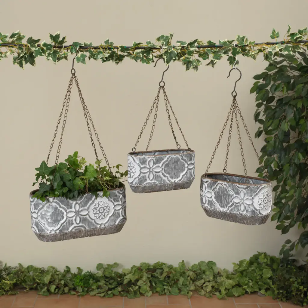 These three charming galvanized metal hanging rectangular plant holders are intended for indoor or outdoor use. They can be arranged together to create a gorgeous, stand-out centerpiece, or separate them to add a unique touch to different areas of your home and patio. Display together or separately. Lg: 13.5" L x 6.25" W x 7.25" H, Med: 11.5" L x 5.25" W x 6.5" H, Sm: 9.75" L x 4" w x 6-in-H. Greenery not included.