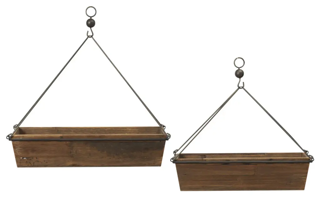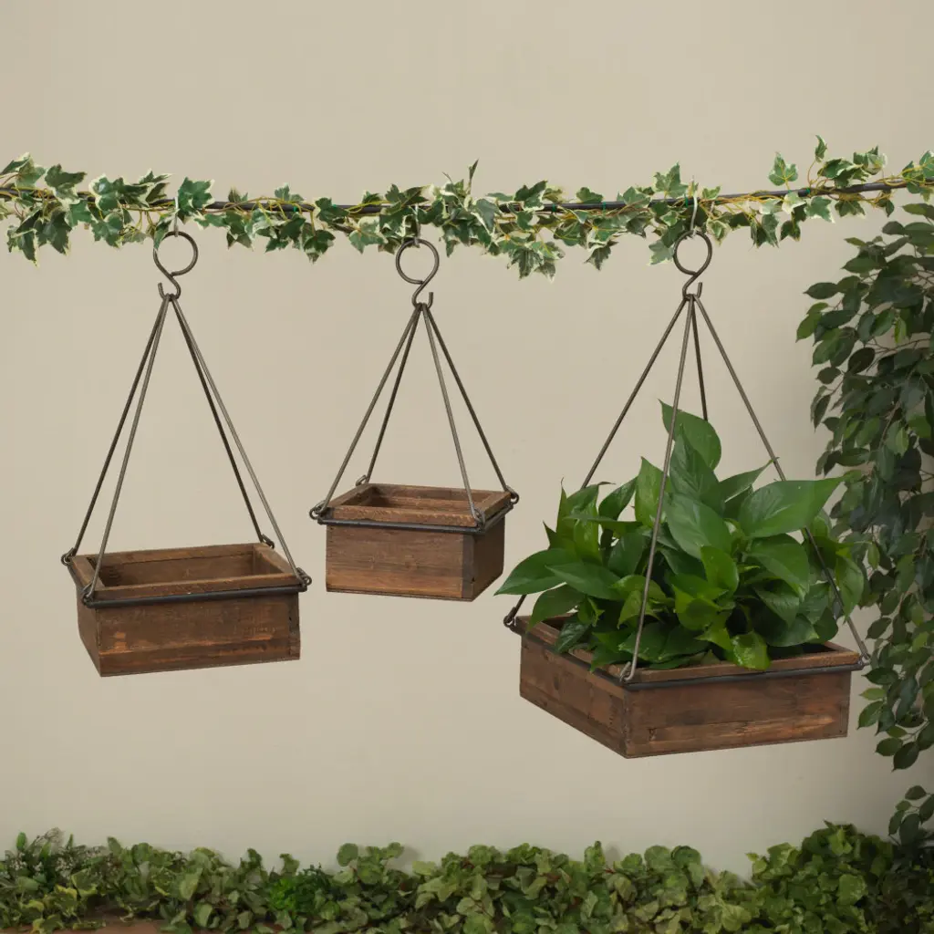 This set of three unique square fir wood and burnished iron plant holders are intended for indoor or outdoor use. The fir wood boxes hang from iron wire framework, hanging from a looped hook. They can be arranged together to create a gorgeous, stand-out centerpiece, or separate them to add a unique touch to different areas of your home or patio. The largest is 27.95-inches high. Light assembly is required.
