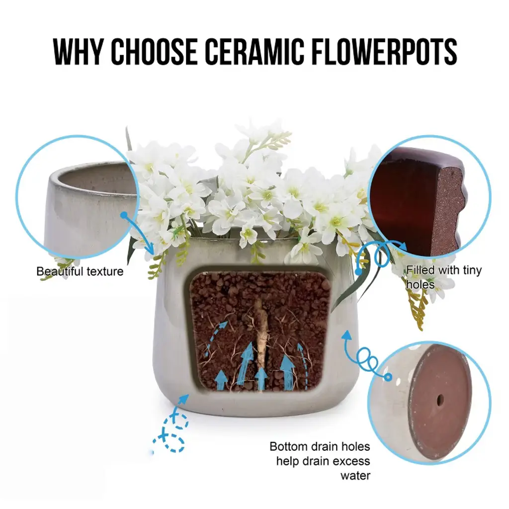 SEVOBAL four-piece planter collection offers endless possibilities for stylish plant displays indoors and out. The creamy gloss finish brings warmth to modern spaces while the durable construction stands up to outdoor elements. These planters combine functional drainage with timeless aesthetics. Their versatile size works equally well on windowsills, patio tables, or as shelf accents, helping you cultivate greenery with designer flair.