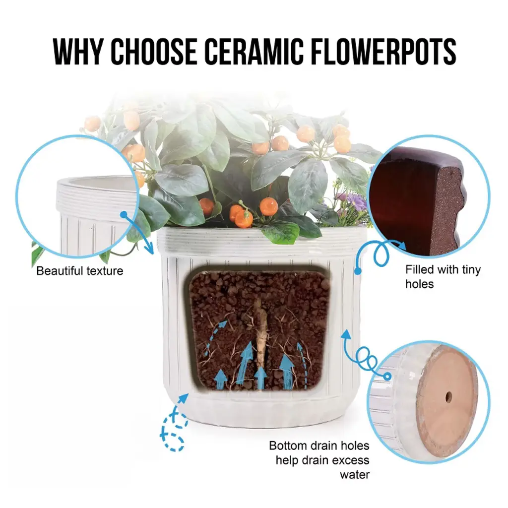 SEVOBAL four-piece planter collection offers endless possibilities for stylish plant displays indoors and out. The creamy gloss finish brings warmth to modern spaces while the durable construction stands up to outdoor elements. These planters combine functional drainage with timeless aesthetics. Their versatile size works equally well on windowsills, patio tables, or as shelf accents, helping you cultivate greenery with designer flair.