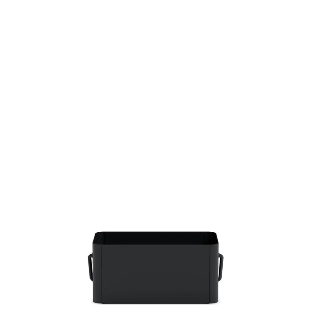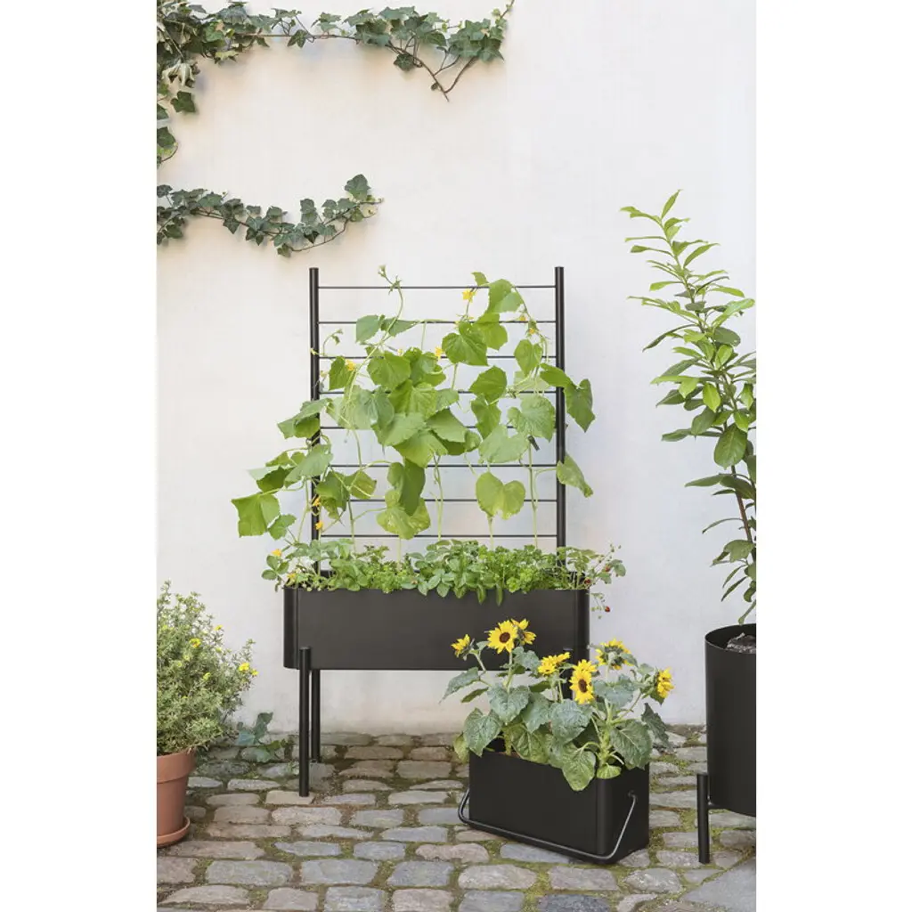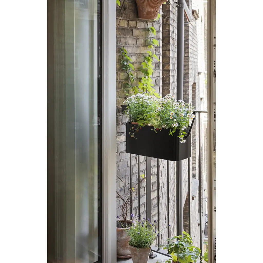 Eva Solo's Simply Grow balcony planter is designed to help your summer flowers and herbs thrive all season long. Designed to attach securely to a balcony railing with a sturdy Velcro strap, the steel planter features a sleek handle and a clever self-watering system that uses a capillary mat at the base to deliver just the right amount of water to your plants. If the built-in water reservoir fills up due to heavy rain or overwatering, the excess water drains out – something to keep in mind when using the planter indoors. For best results, place your plants in their own pots inside the box. This ensures the self-watering system works as intended and makes it easier to rearrange or switch out plants. The Simply Grow collection features modern, low-maintenance garden essentials designed especially for outdoor use. Made from weather-resistant galvanized steel, the planters and pots are built to withstand the elements year-round – even in harsh northern climates. Powder-coated in sleek black, the collection's elegant, streamlined forms and matching plant supports suit everything from urban balcony gardens to larger patios and yards.