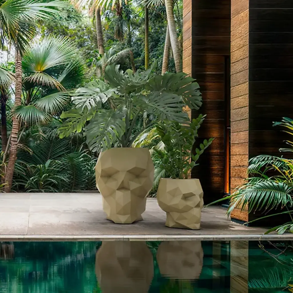 The Skull Outdoor Planter from Vondom juxtaposes life and mortality in a single thought-provoking piece. Designer Teresa Sapey drew inspiration from skull artifacts discovered during her international travels, translating their mystical quality into functional garden art. This self-watering planter provides a cavity for succulents or other plants, creating an unexpected contrast between growing life and the symbolic vessel that contains it. The polyethylene construction ensures long-lasting performance in outdoor settings. Gardens gain philosophical depth with this unconventional planter that invites contemplation about nature's cycles while serving practical horticultural needs.