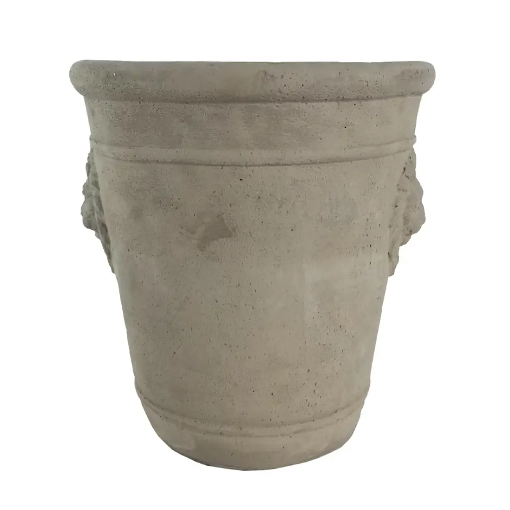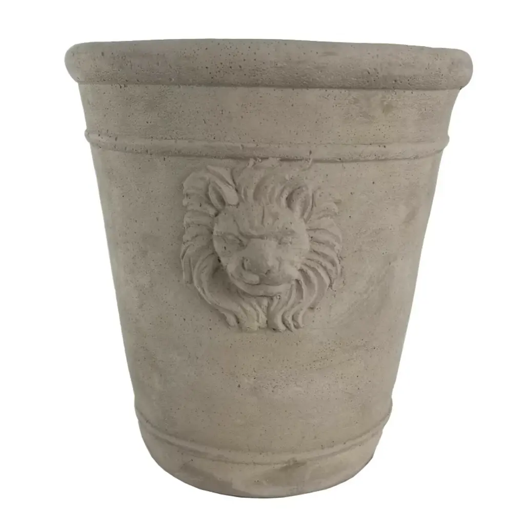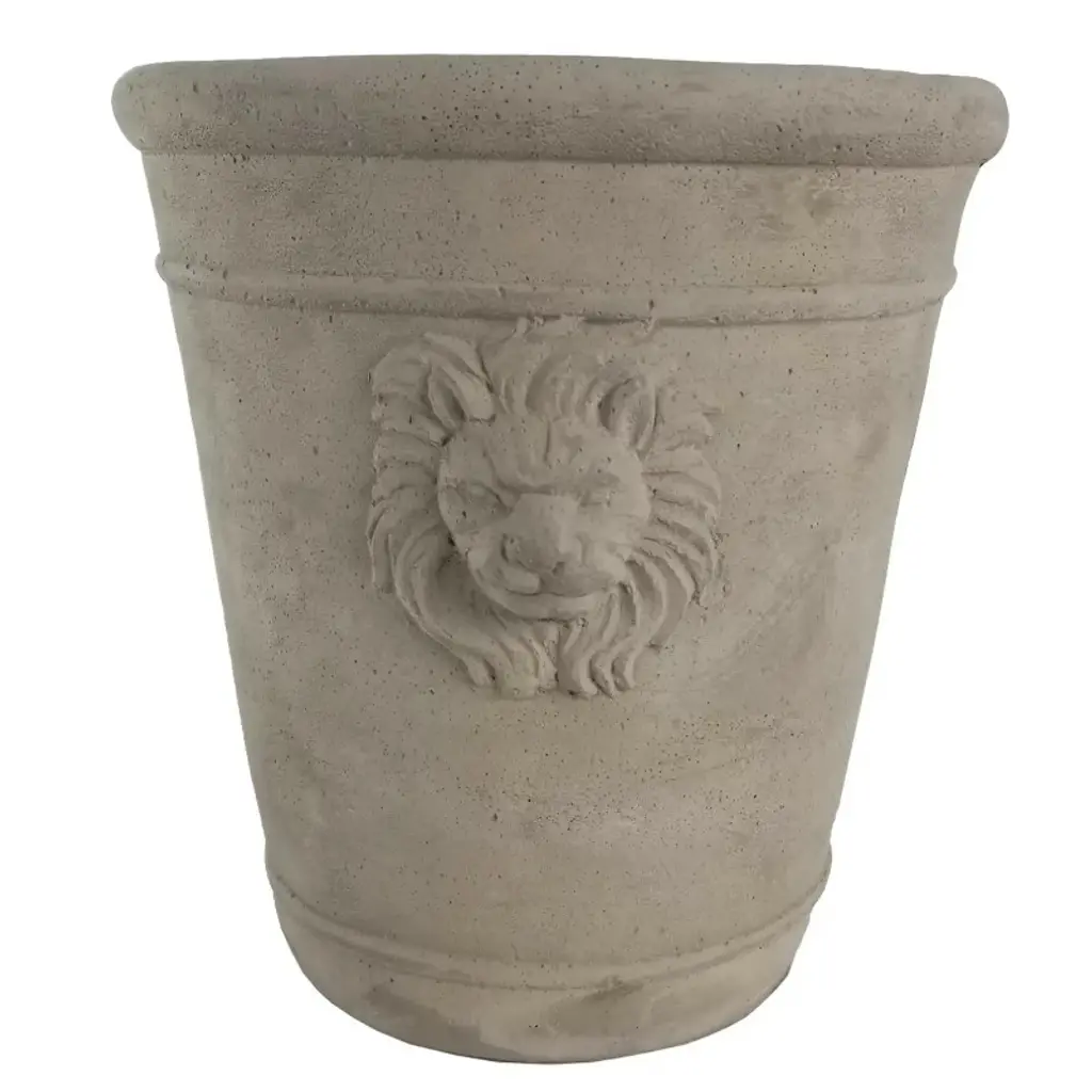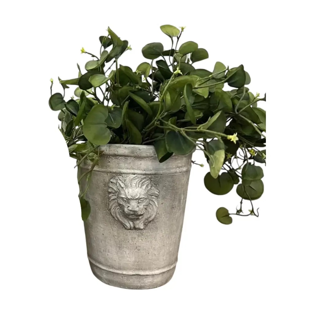 Bring bold style and character to your indoor or outdoor space with this round cement planter featuring a forward-facing lion motif on two sides. Its striking design adds a dramatic touch to any tabletop, shelf, patio, or garden corner. Available in three sizes—medium, large, and tall—this planter accommodates a variety of plants, succulents, or decorative arrangements. Crafted from cement, each piece develops natural variations over time, giving it a distinctive look. Lightweight and versatile, it’s an eye-catching addition for both plant display and home décor.