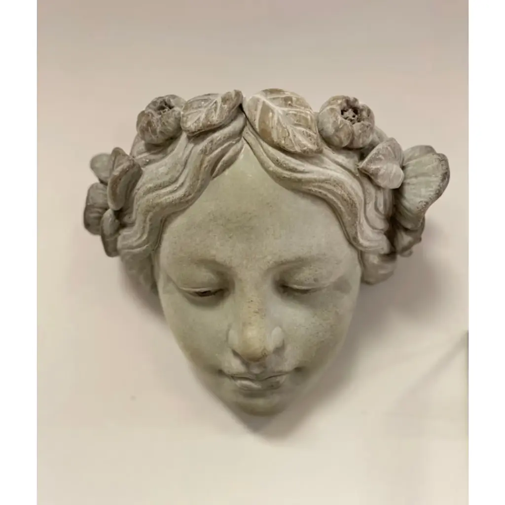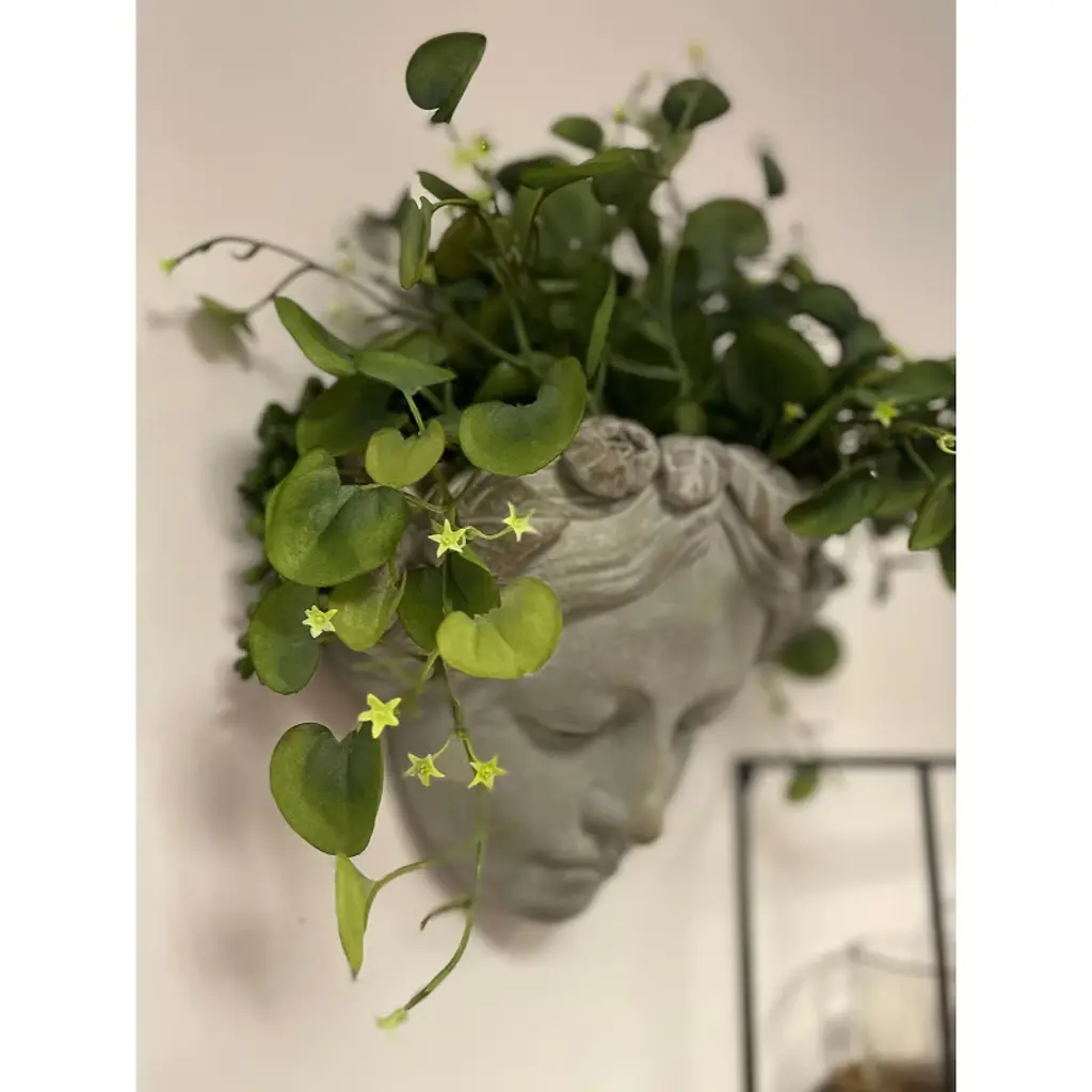 The Cast Cement Wall Mount Sun Goddess Planter features a beautifully detailed sun goddess design, offering a distinctive and artistic touch to your space. Measuring 10 inches in width, 5.9 inches in depth, and 7.8 inches in height, this planter is designed to be mounted on the wall, making it a space-saving solution for displaying plants. Its durable cement construction ensures long-lasting quality, while the unique design adds a charming focal point to both indoor and outdoor areas. Ideal for enhancing your décor with a touch of elegance and creativity.