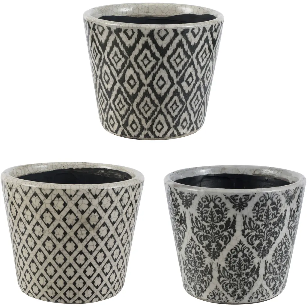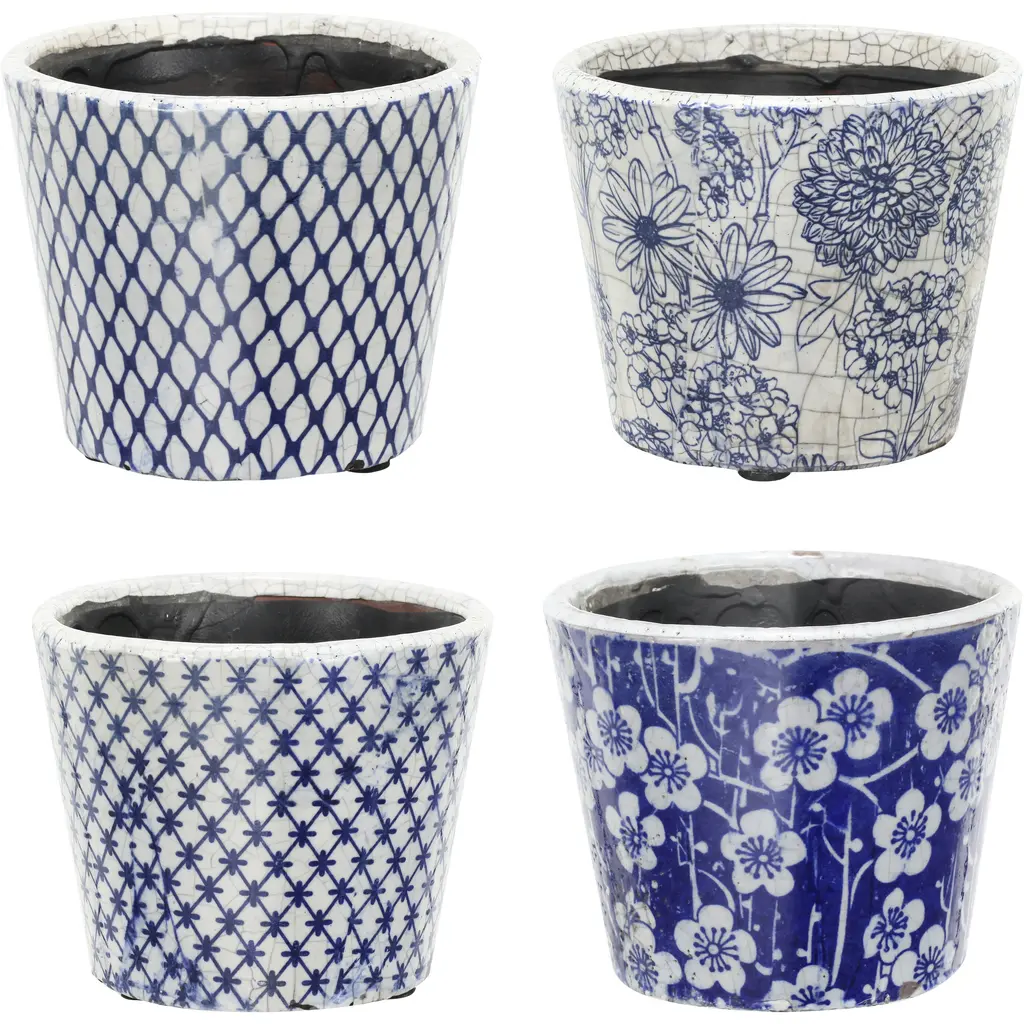This set of four planters features coordinating patterns in a traditional color combination for a classic look. The bold combination of rich royal blue and crisp white paired with a crackled patina gives these terracotta pots an elegant charm. Use in separate rooms to create a cohesive style around the home or display all four together to create a pleasing miniature garden.