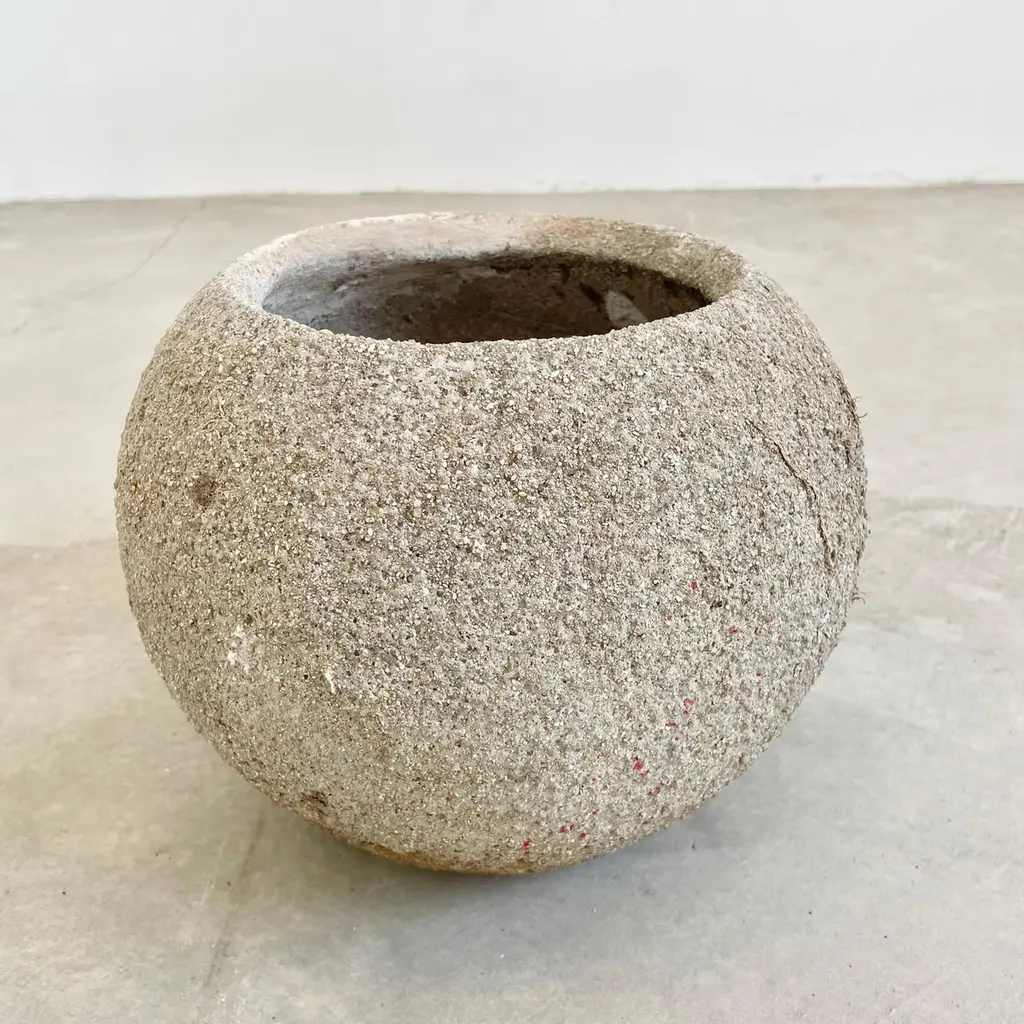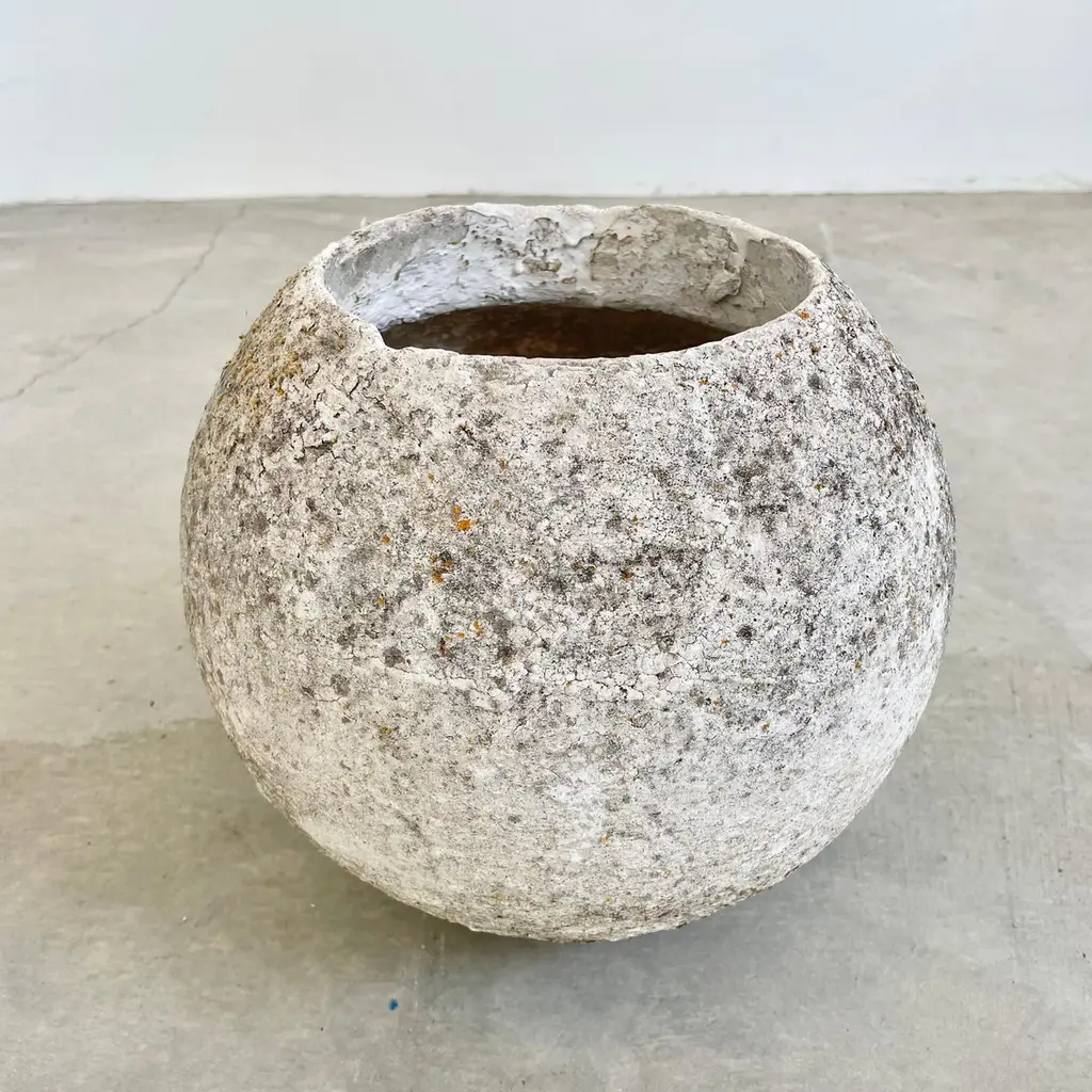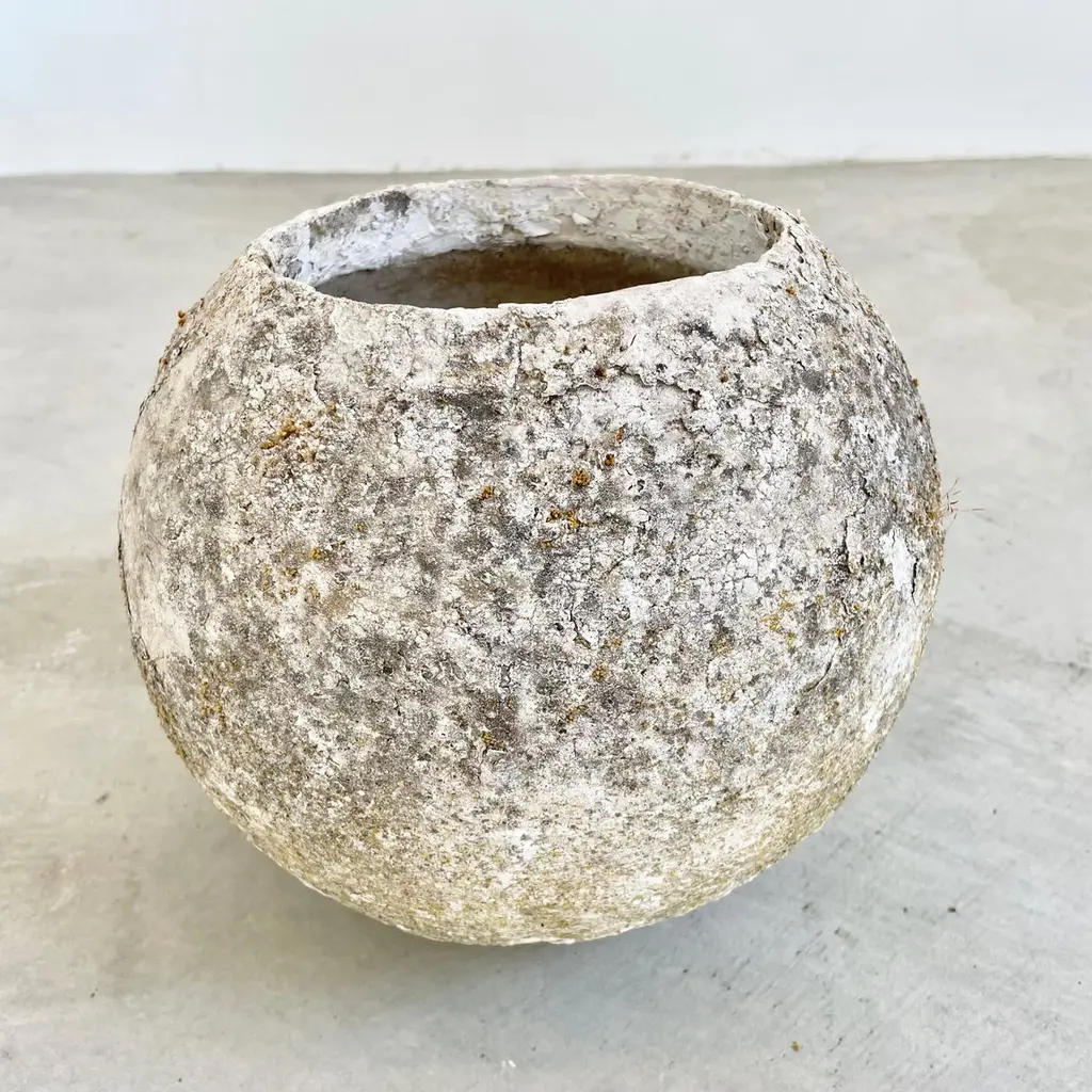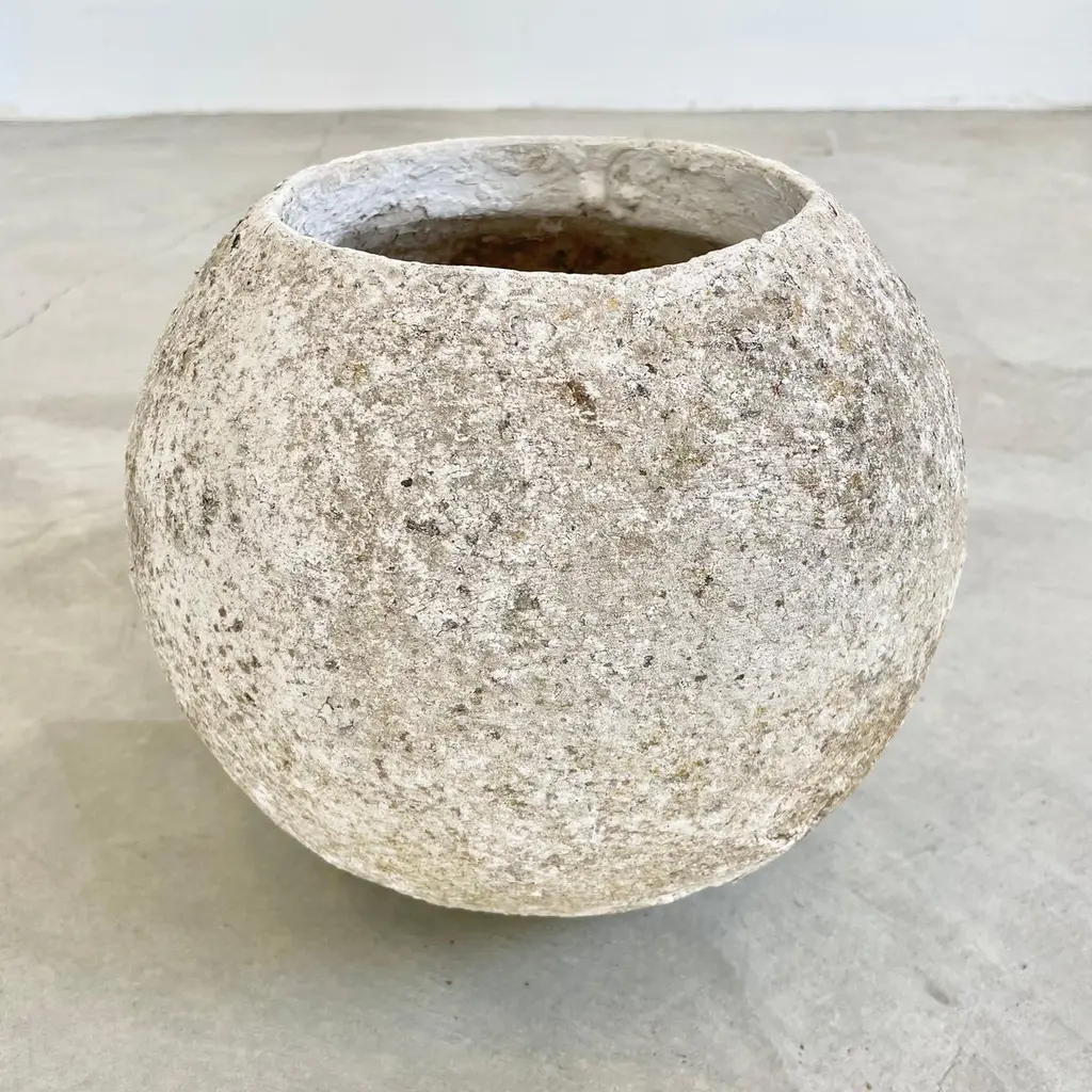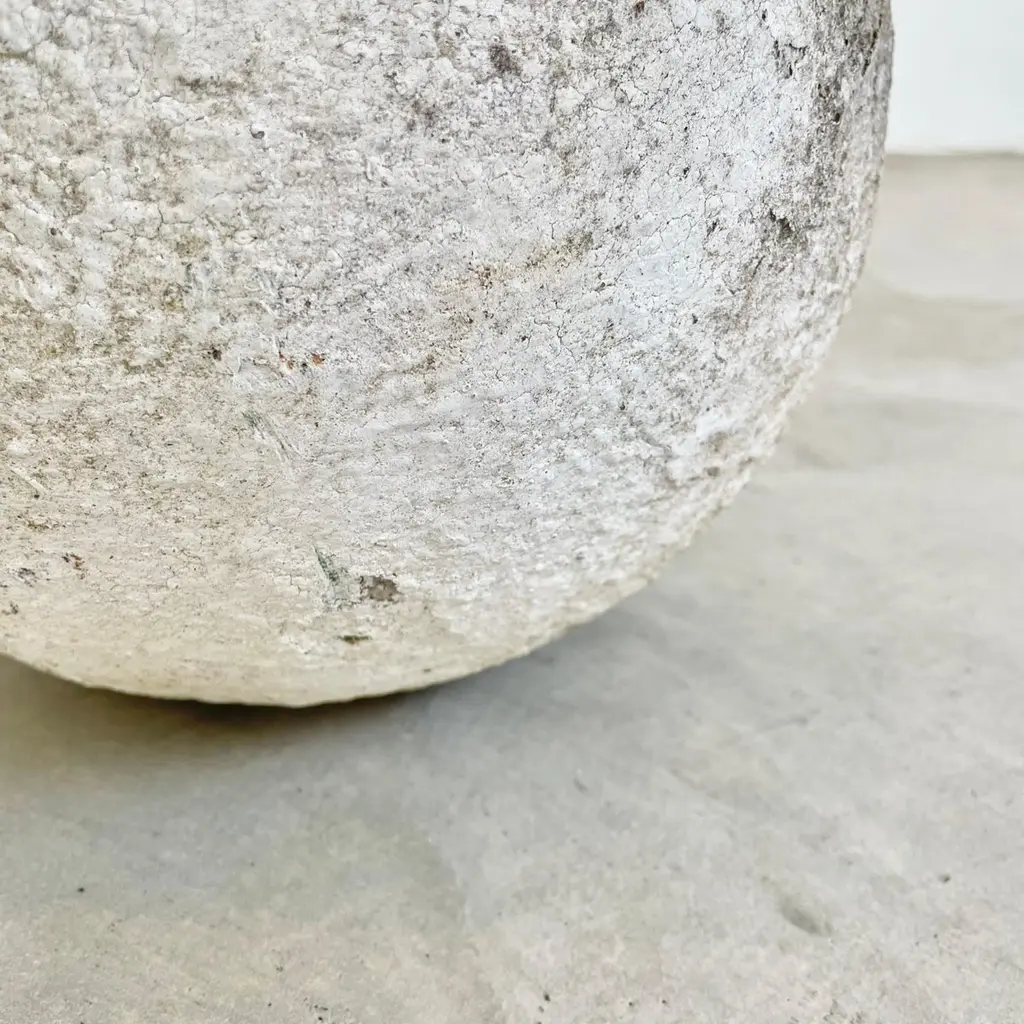Small concrete Swiss ball planters in the style of Willy Guhl. Great patina to each planter. Great for indoors or outside. Heavy and substantial. Priced individually. Larger sizes available in separate listings.