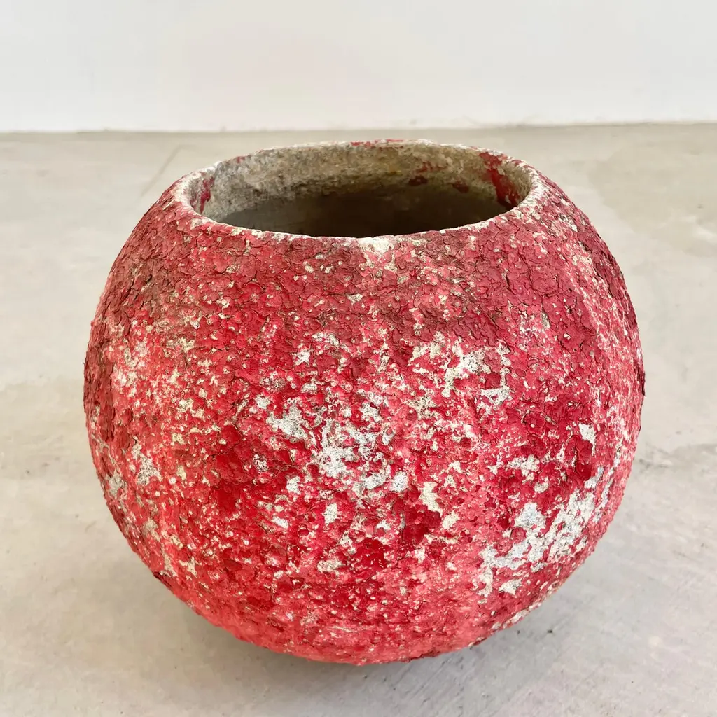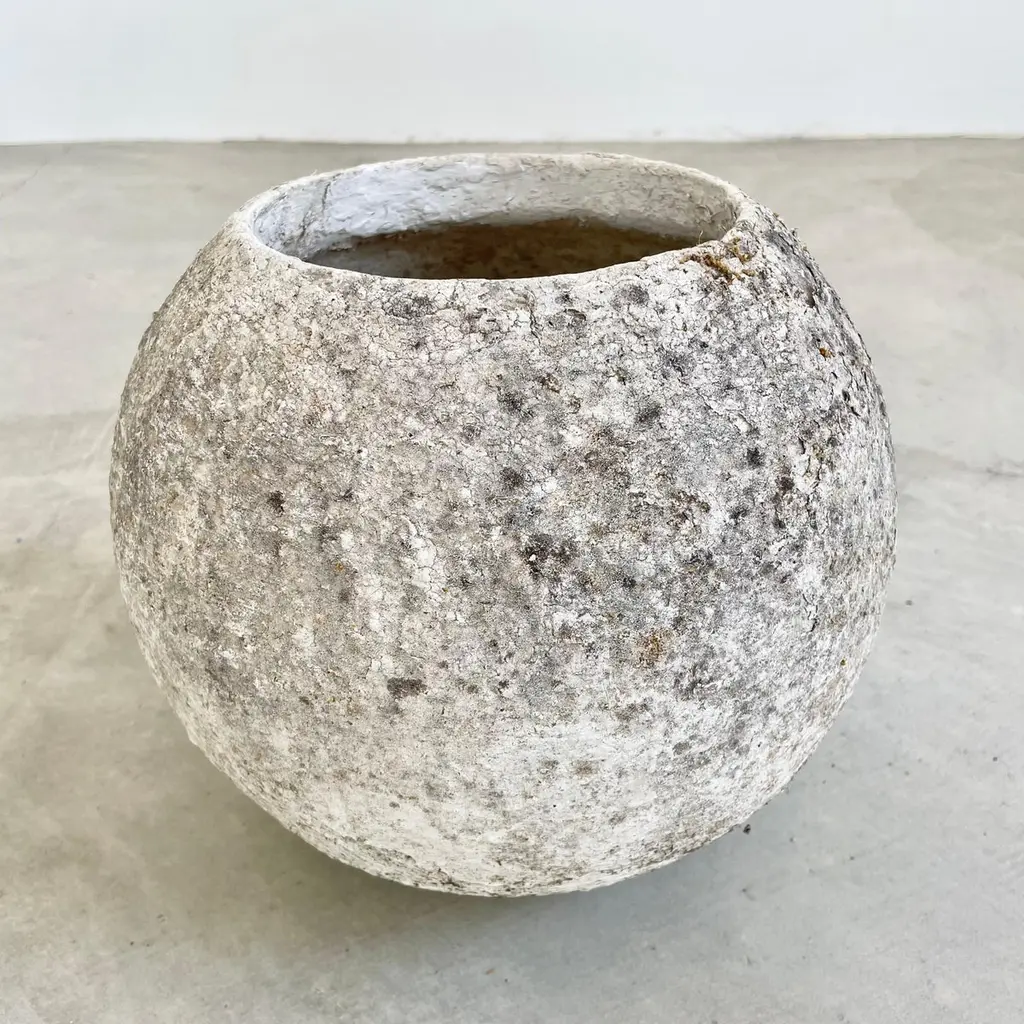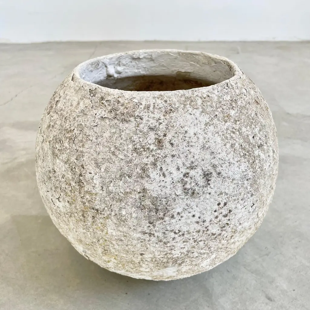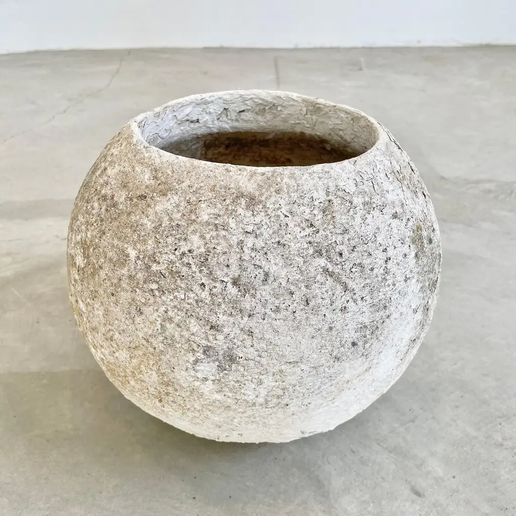 Small concrete Swiss ball planters in the style of Willy Guhl. Great patina to each planter. Great for indoors or outside. Heavy and substantial. Priced individually. Larger sizes available in separate listings.