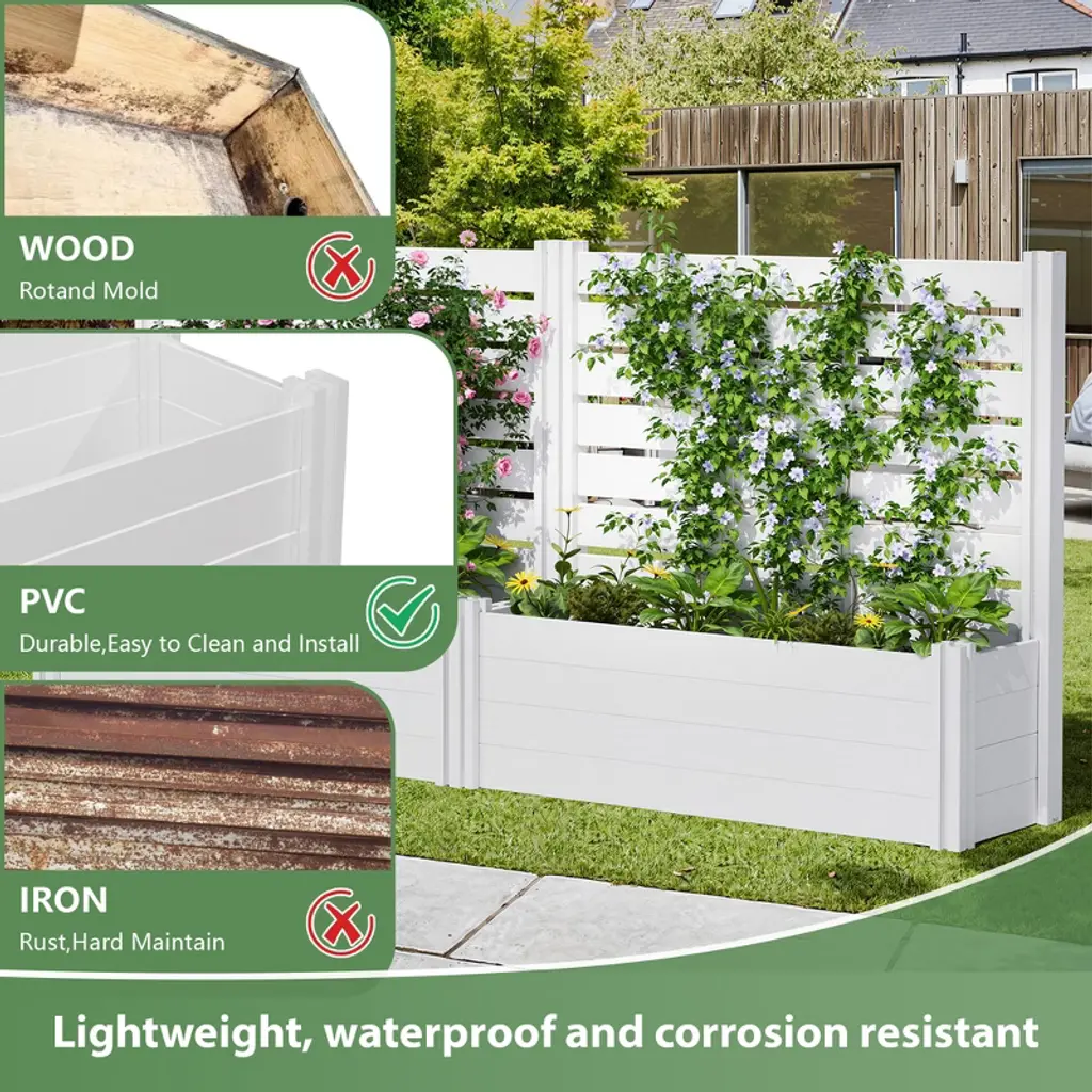 Transform your backyard into a thriving garden oasis with our durable and stylish PVC Raised Garden Bed with Trellis Planter Box. Designed for both aesthetics and functionality, this garden bed is perfect for growing a variety of plants, vegetables, and flowers. Enjoy the benefits of elevated planting with improved soil drainage, reduced weed growth, and enhanced accessibility.