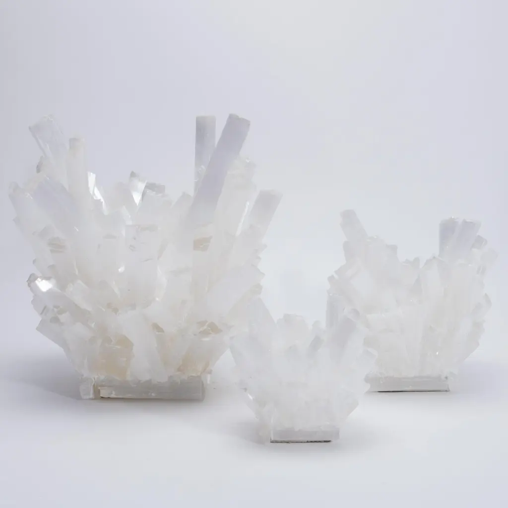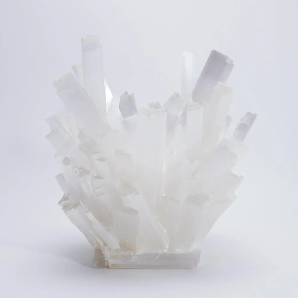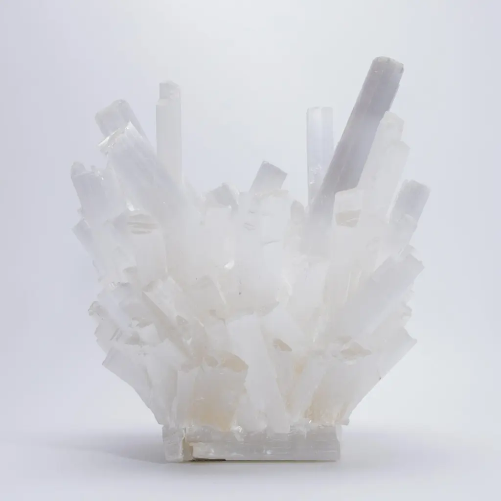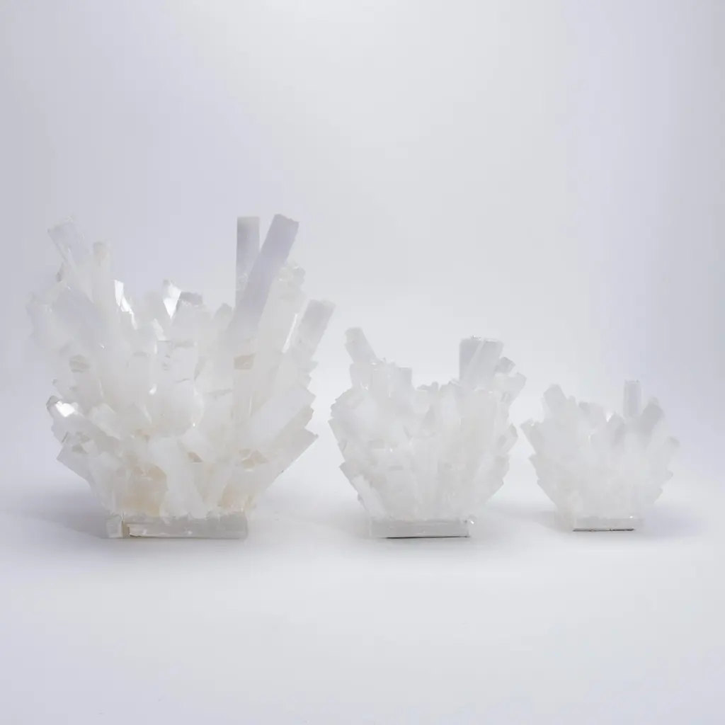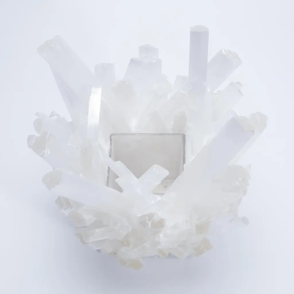 Indulge in the captivating allure of Kathryn McCoy's Rock Crystal Collection, a masterpiece that seamlessly blends nature's raw beauty with exquisite craftsmanship. Available in various sizes and customizable with a selection of different rock crystals, this decorative planter bowl embodies the essence of sophistication and uniqueness. Selenite, characterized by its milky white translucency and fine striations, exudes a sense of purity and tranquility. Its smooth surface reflects light gently, creating a serene ambiance that enhances any environment.The square shape of the bowl adds a modern twist to its classic material, offering a contemporary interpretation of natural beauty. The clean lines and geometric form highlight the minimalist aesthetic, making it a versatile piece for various interior styles.Designed to accommodate plants and greenery, the planter bowl serves as a functional yet decorative element. Its spacious interior provides ample room for arrangements of succulents, herbs, or flowers, adding a touch of natural vitality to indoor spaces.
