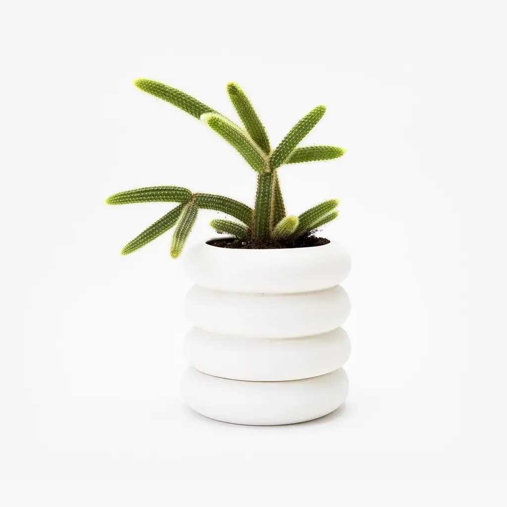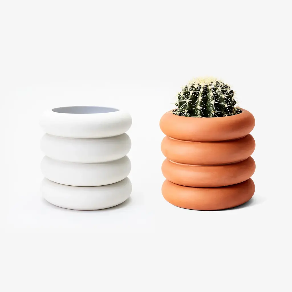Inspired by high voltage ceramic insulators used on power lines, this modern white dolomite planter seamlessly blends industrial and rustic design cues. New York-based studio Chen Chen & Kai Williams designed the Areaware Stacking Planter as a compact and versatile 2-in-1 product. The two circular stoneware elements fit together perfectly with the planter sitting on top of a saucer. The user can easily separate them if needed by simply lifting out the top ring. Made with a matte exterior, the planter has a glossy finish on the interior. Available in two sizes, this modern terracotta planter comes in short and tall versions. Perfect for cacti, succulents, or herbs.
